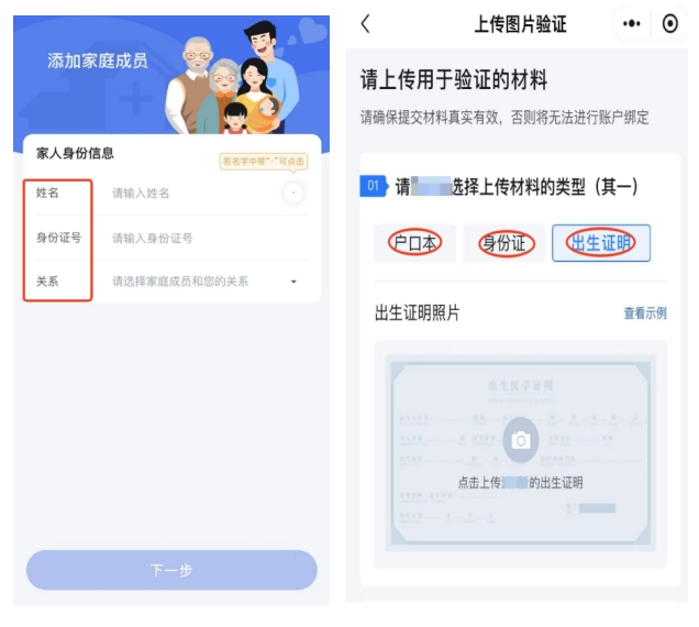 第四步 填写需绑定的家庭成员信息,上传验证材料(户口本、身份证、出生证明选其一)。