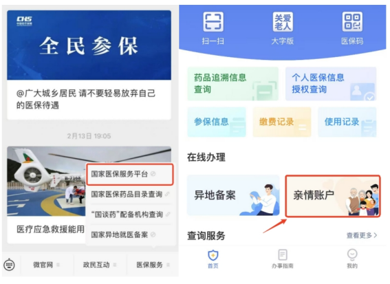 第一步 关注“国家医保局”微信公众号,点击医保服务→国家医保服务平台,进入”亲情账户”操作页面。