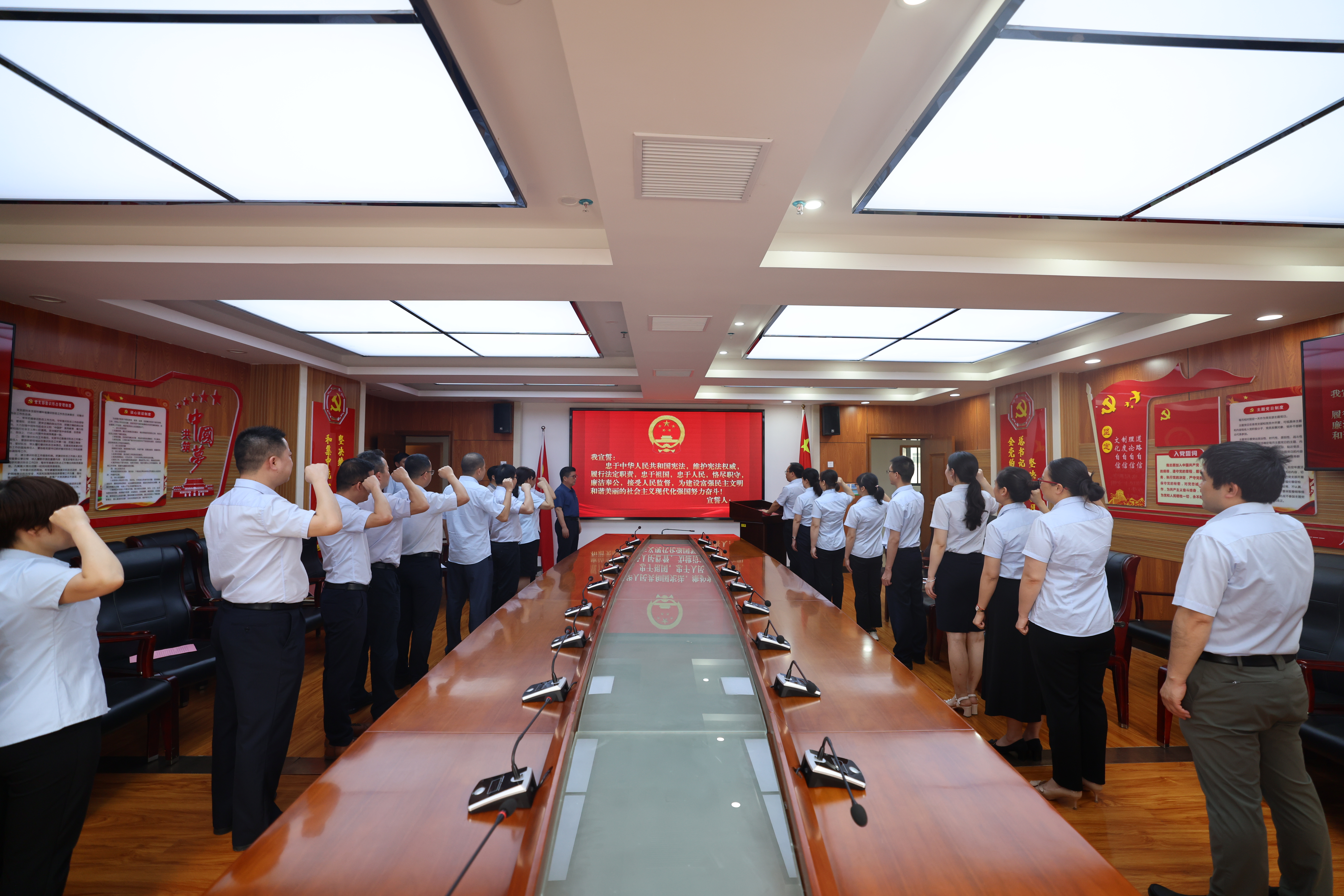 宣誓人员身着院服,整齐列队。在韦义甜的监誓下,领誓人左手抚《中华人民共和国宪法》,右手高举,领诵誓词,新任中层干部高举右拳,跟诵誓词,向宪法许下庄严承诺:“我宣誓:忠于中华人民共和国宪法,维护宪法权威,履行法定职责,忠于祖国、忠于人民,恪尽职守、廉洁奉公,接受人民监督,为建设富强民主文明和谐美丽的社会主义现代化强国努力奋斗!”