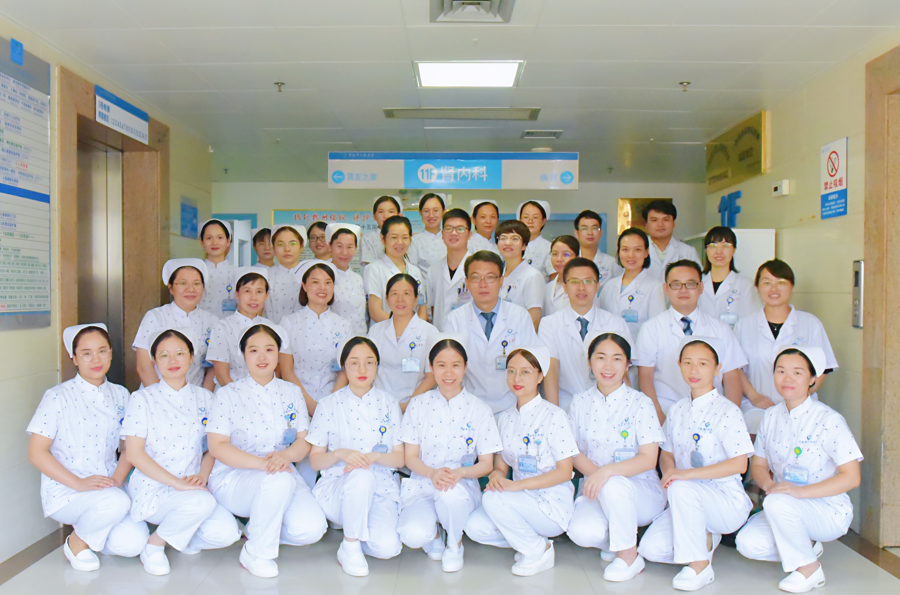 科室拥有独立住院病区及门诊,病区编制床位42张,实际开放床位大于50张,配置有河池市规模最大的血液透析治疗室,腹膜透析诊疗室,结肠透析治疗室,是河池市血液净化治疗质量控制中心挂靠单位及医院重点建设学科。现有医护人员47名,其中医生13名(主任医师1名,副主任医师2名,主治医师8名,住院医师2名),护理人员44名(副主任护师2名,主管护师6名,护师16名,护士20名,其中专科护士3名,血透资质28人,腹透资质7人)。