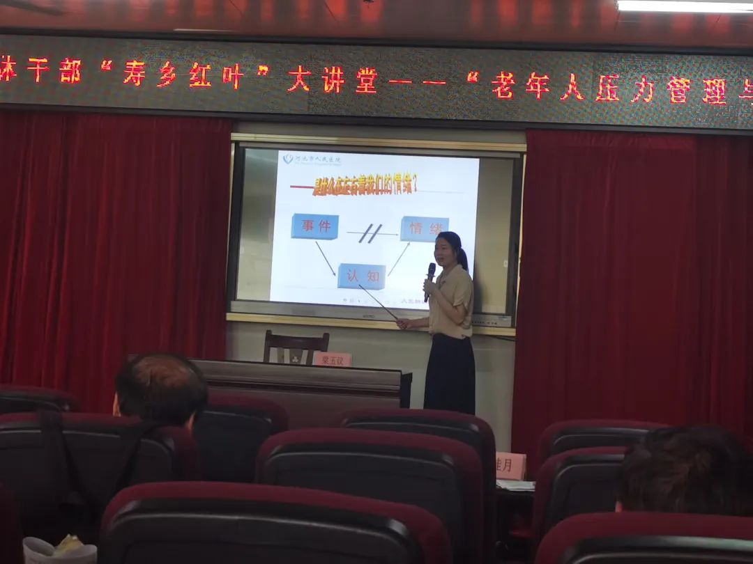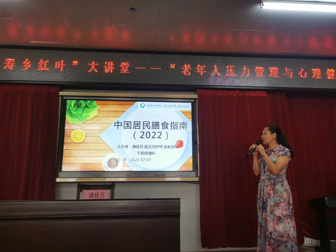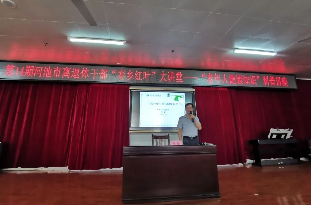为进一步增强老年人医疗保健意识,提升健康水平,2022年7月7日,河池市人民医院干部保健科联合市老年大学举办第14期河池市离退休干部“寿乡红叶”大讲堂——“老年人健康知识”科普讲座。