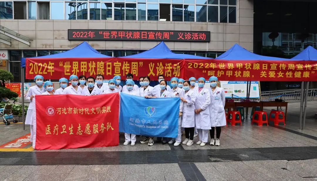 5月28日上午,河池市人民医院韦仁杰副院长带领内分泌科、甲状腺乳腺外科及核医学科等多学科医疗专家组成的志愿者团队在医院门诊综合楼前开展了世界甲状腺日宣传周义诊志愿服务活动。