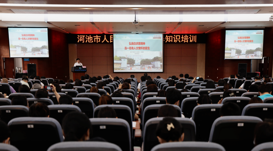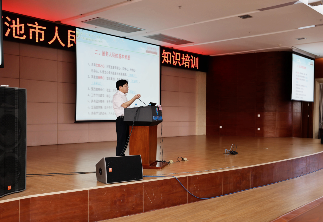 6月1日,河池市人民医院在门诊综合楼23楼举行人文素养知识培训,大会邀请到南宁市第四人民医院党委书记吴锋耀进行授课,医院党政领导班子、中层以上干部、临床医务工作者、各职能部门工作人员聆听了本次授课。党委书记韦义甜主持培训会议。