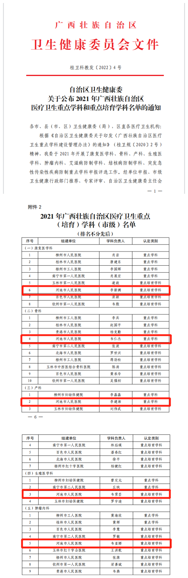 近日,自治区卫生健康委公布2021年广西壮族自治区医疗卫生重点学科和重点培育学科名单,河池市人民医院骨科和产科荣获广西医疗卫生重点学科,生殖医学中心、肿瘤内科及康复医学科荣获广西医疗卫生重点培育学科,标志着河池市人民医院重点学科建设工作取得又一次重大突破!