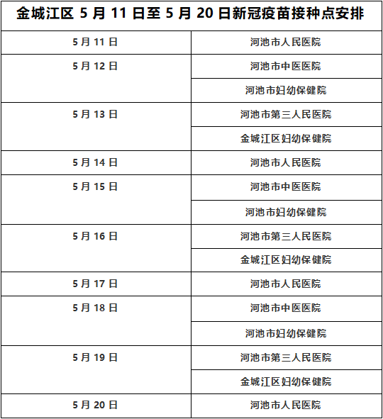 根据河池市金城江区新冠病毒疫苗接种工作专班安排,2022年5月11日至5月20日新冠疫苗接种安排如下,请各位群众根据需求选择新冠疫苗接种点接种。