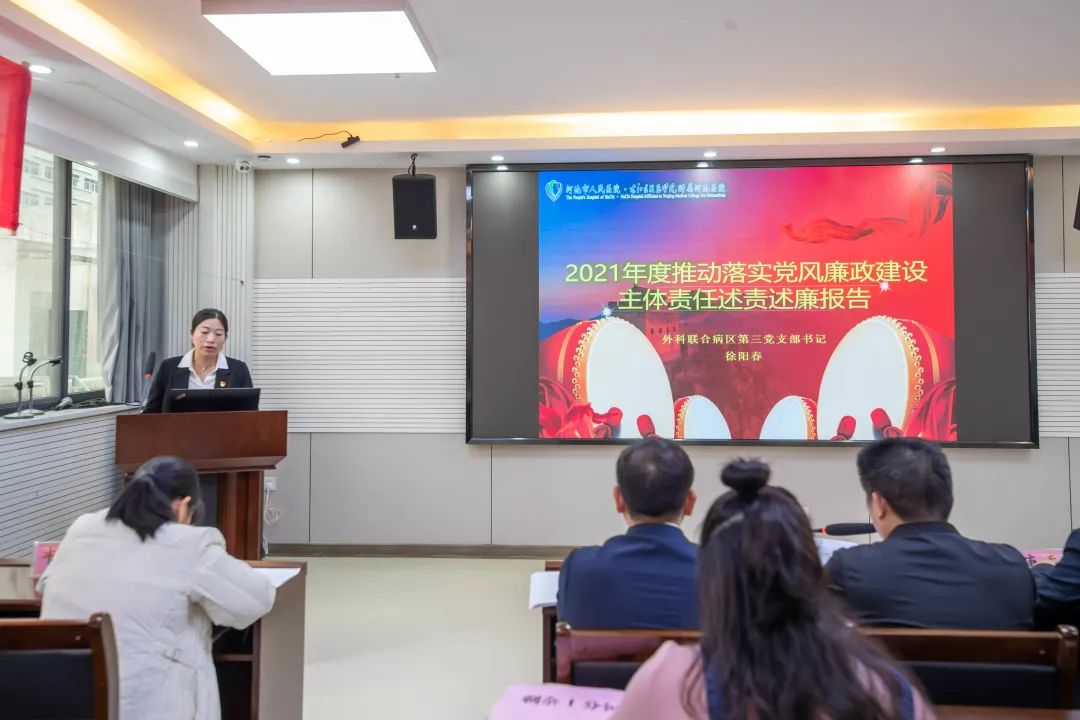 述职会上,财务科党支部、总务科党支部、肾内科党支部、儿科病区党支部、感染性疾病科党支部、医技联合科室第二党支部书记依次以PPT形式对抓基层党建工作进行述职,行政联合科室第三党支部、住培轮转人员党支部、妇产生殖党支部、普通外科党支部、外科联合病区第二党支部、外科联合病区第三党支部书记依次以PPT形式对推动落实党风廉政建设主体责任进行述责述廉,全面阐述了支部在2021年党建工作和党风廉政建设工作中的亮点与不足,剖析原因,并提出了下一步的工作思路和改进举措。