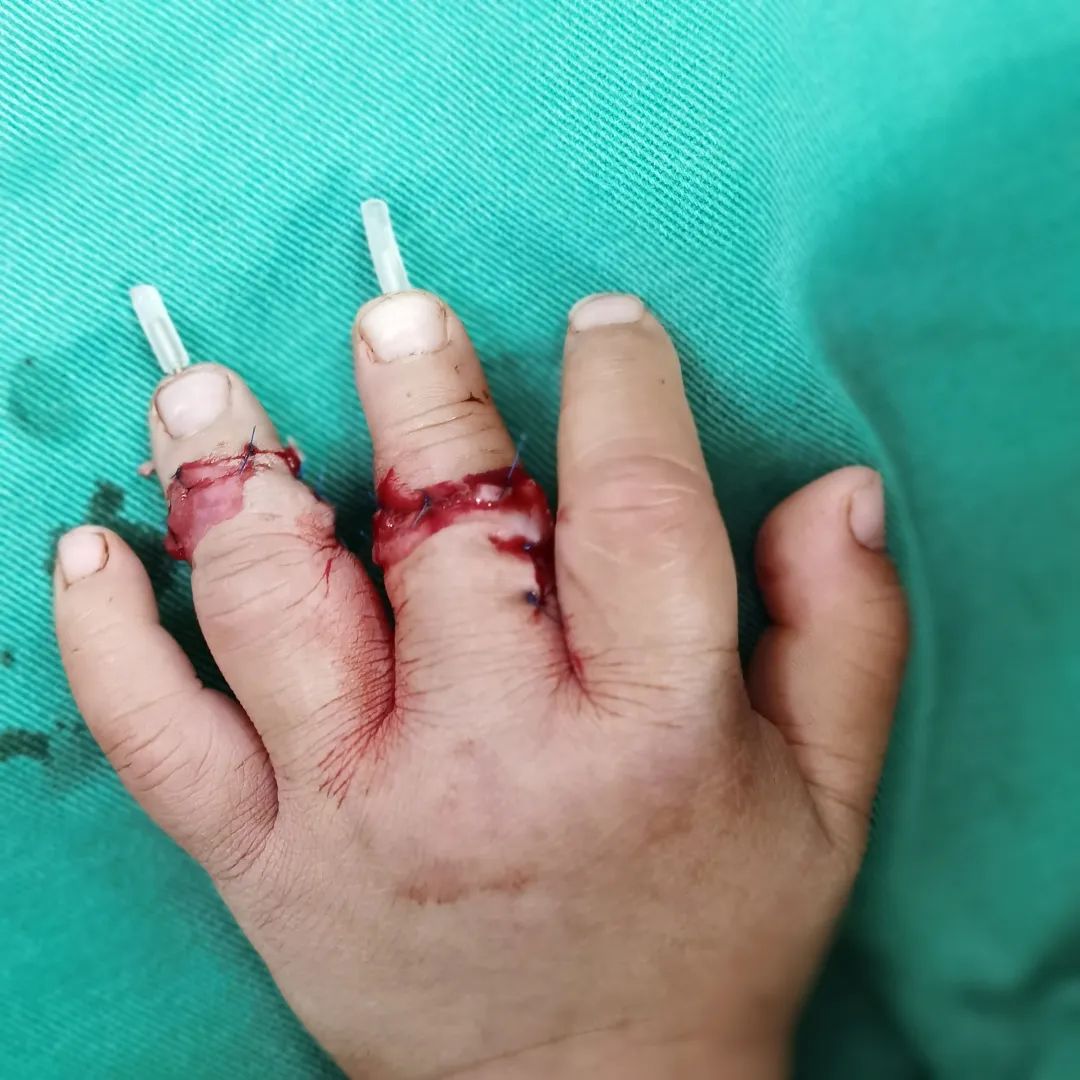 只见一位妈妈抱着孩子来到科室,慌乱得不知所措,孩子哭得撕心裂肺手上的敷料也已浸透了鲜血。黄大波副主任立即查看患儿的伤口,并详细询问孩子受伤的情况。据了解,患儿名叫球球,5小时前在家中不慎被打米机皮带绞伤左手,当时多个手指瞬间血肉模糊,更糟糕的是中环指已完全离断,被一同送到了医院。受伤后妈妈带着球球到当地县医院就诊并进行了简单包扎,由于当地医疗技术水平有限,随即转诊到我院治疗。“医生,医生,求求你们,赶快帮我的孩子做手术,一定要保住孩子的手指,他才一岁多,不能没有手啊。”球球妈妈哽咽地说道。
