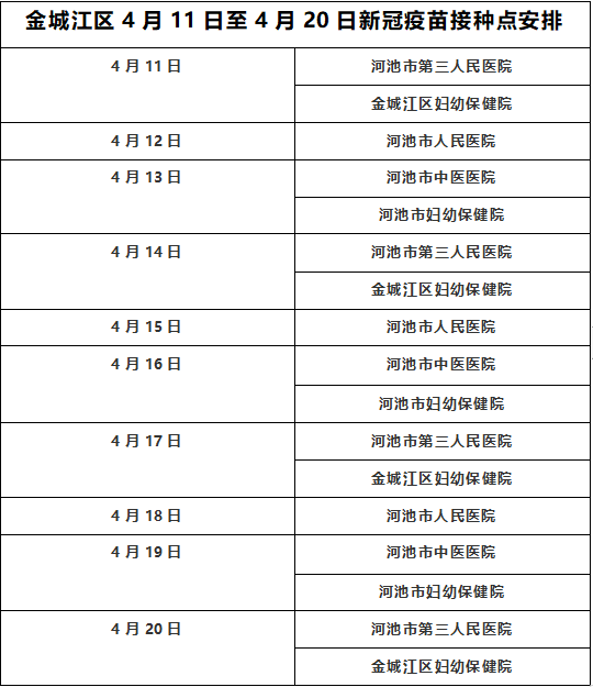 根据河池市金城江区新冠病毒疫苗接种工作专班安排,2022年4月11日至4月20日新冠疫苗接种安排如下,请各位群众根据需求选择新冠疫苗接种点接种。