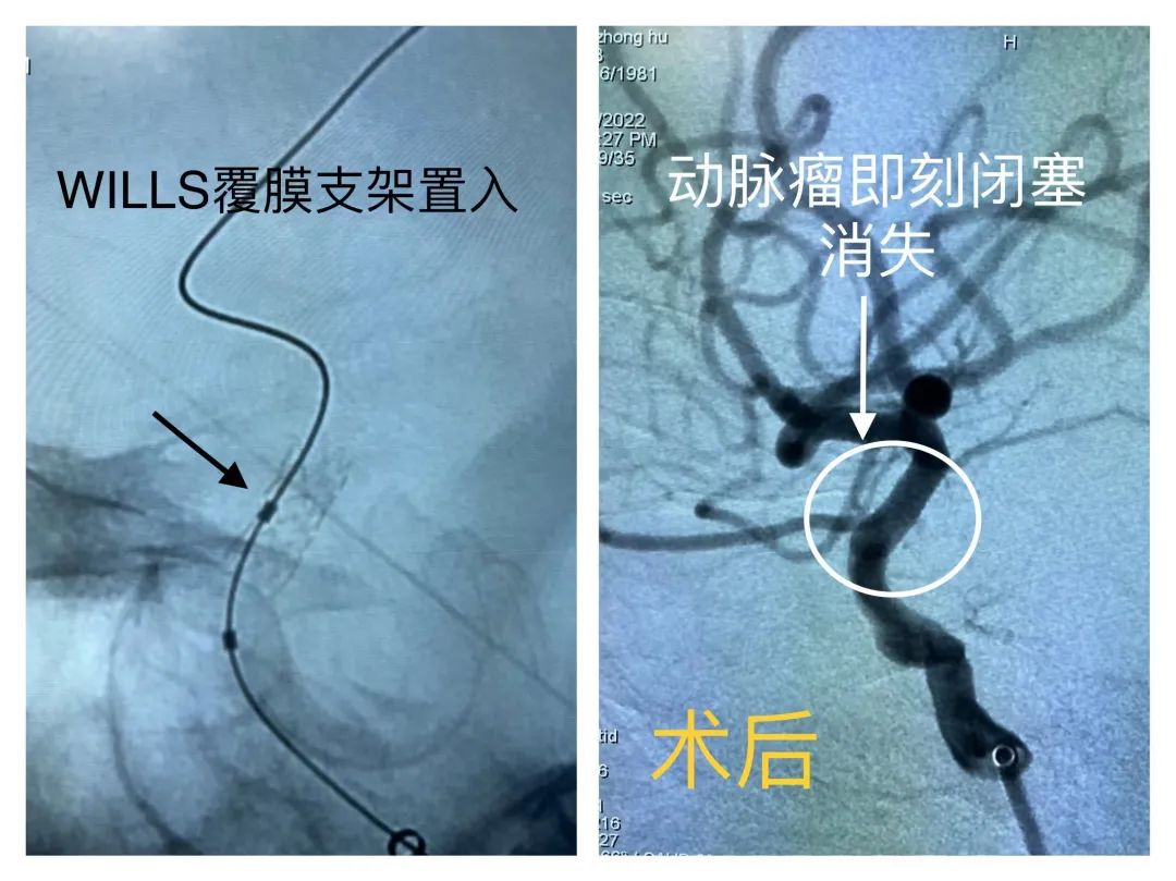 3天后,神经外科副主任兰展团队为患者行WILLIS颅内覆膜支架置入微创介入手术,经过2个多小时的手术,患者即刻达到止血、重塑血管的目的,返回重症医学科一病区继续治疗。