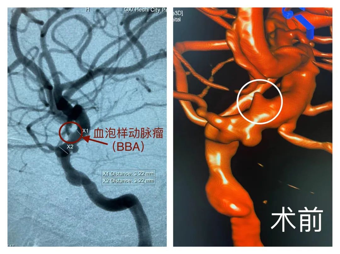 韦先生抵达河池市人民医院后,在介入室医护人员的密切配合下,神经外科为患者急诊行全脑血管造影术,发现右侧颈内动脉床突段前上壁有一锥形凸起的微小动脉瘤,考虑为血泡样动脉瘤(BBA)。