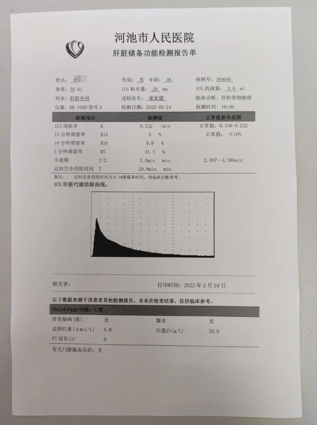 近期,河池市人民医院肝胆外科,46岁谭先生(化名),因诊断为肝占位性病变、肝血管瘤,结合肝脏磁共振动态增强结果考虑肝内胆管癌,经综合检查评估后行手术治疗。术前,谭先生在医生的建议下,接受了肝功能储备检测(ICG清除率检测),显示谭先生肝储备功能好,能耐受肝切除手术。与患者及家属详细沟通之后,病人最终行荧光腹腔镜下肝切除术+胆囊切除术,目前随访病情稳定。