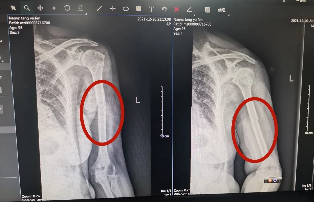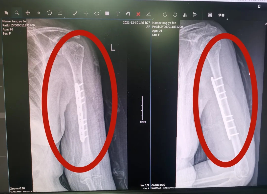 据了解,三年前唐奶奶因不慎摔倒,导致左股骨转子间骨折,遂来到河池市人民医院创伤手外科接受微创PFNA内固定术,术后恢复效果佳,已能正常行走。2021年12月26日,唐奶奶在家又不慎摔倒,出现左上臂疼痛、畸形、不能屈伸活动,剧烈的疼痛使她难以起床,生活无法自理。唐奶奶的子女们回想起上一次手术后的良好效果,于是,他们再次来到河池市人民医院创伤手外科请求帮助。创伤手外科副主任姚泓成得知情况后,仔细查看检查结果,诊断为左肱骨干骨折,考虑到老人已经96岁高龄,再加上患有多年的高血压、冠心病,姚泓成副主任组织医疗团队第一时间展开讨论,最终决定为老人做骨折手术。