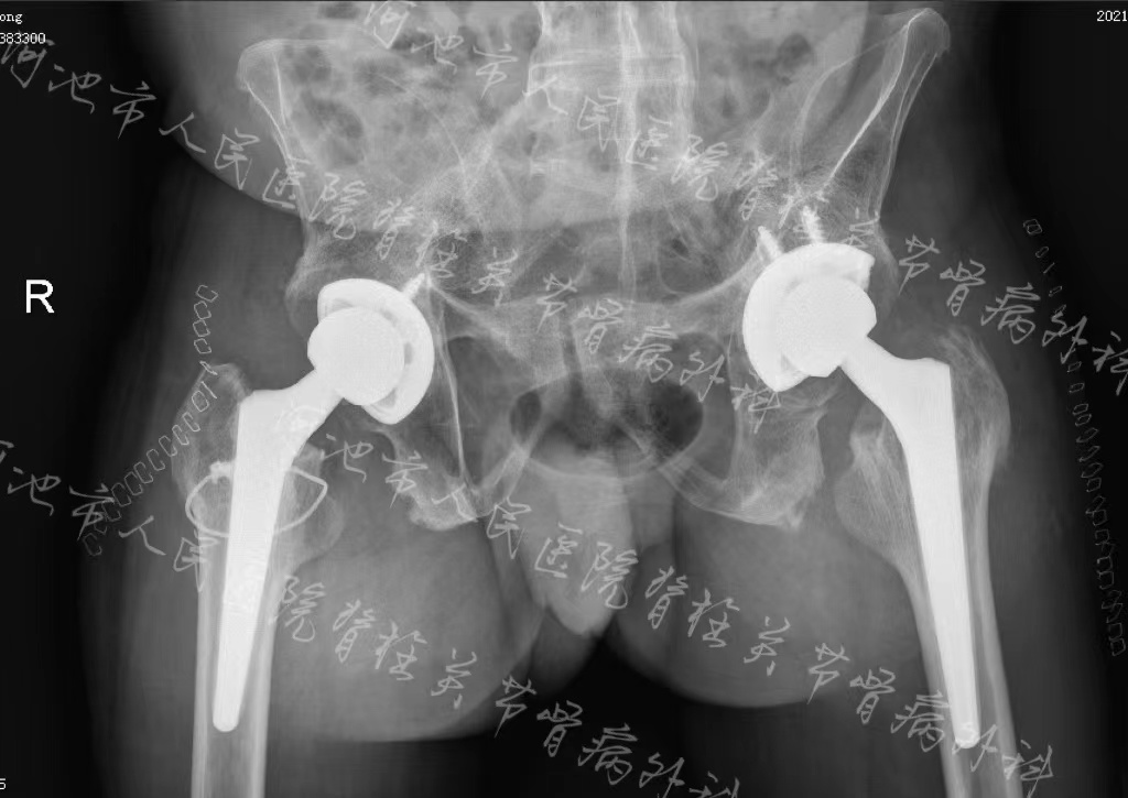 术前影像学检查结果提示:强直性脊柱炎,累及双髋关节