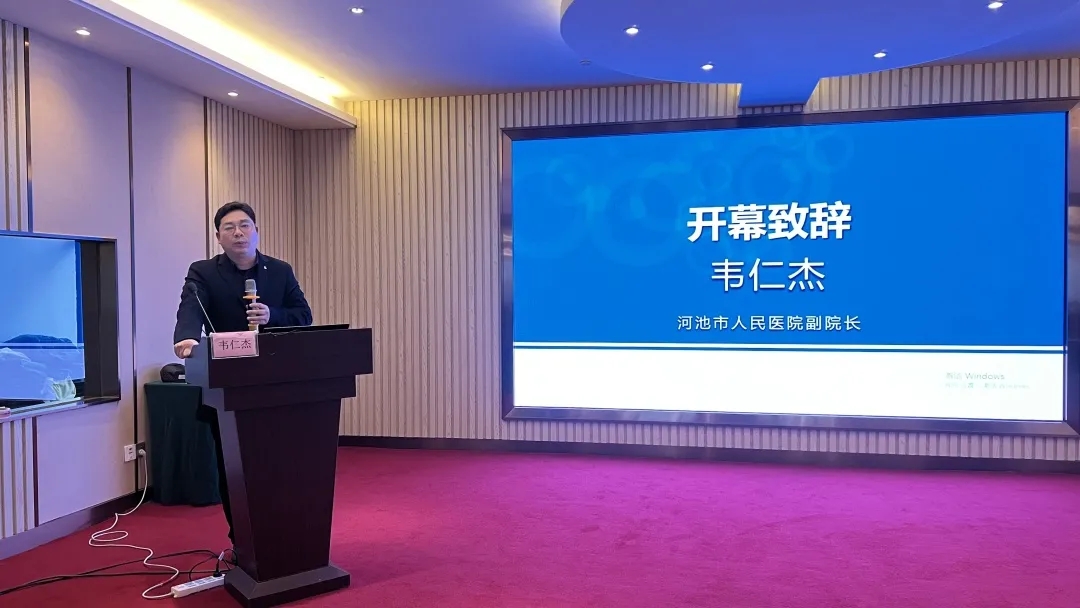 河池市人民医院韦仁杰副院长致辞。他向与会人员介绍了医院肿瘤学科的发展情况,他指出,希望与会的同志珍惜此次学习机会,虚心向专家学习,并做进一步学术交流,将肿瘤诊疗新进展、新理论应用于临床,服务于肿瘤患者。