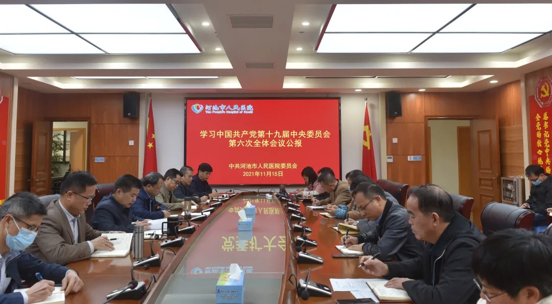 11月15日下午,河池市人民医院召开党委扩大会议,集中学习《中国共产党第十九届中央委员会第六次全体会议公报》,并研究部署贯彻落实工作。河池市人民医院党委书记韦义甜同志主持会议,与会党委委员和各党支部书记结合自身学习体会作交流发言。