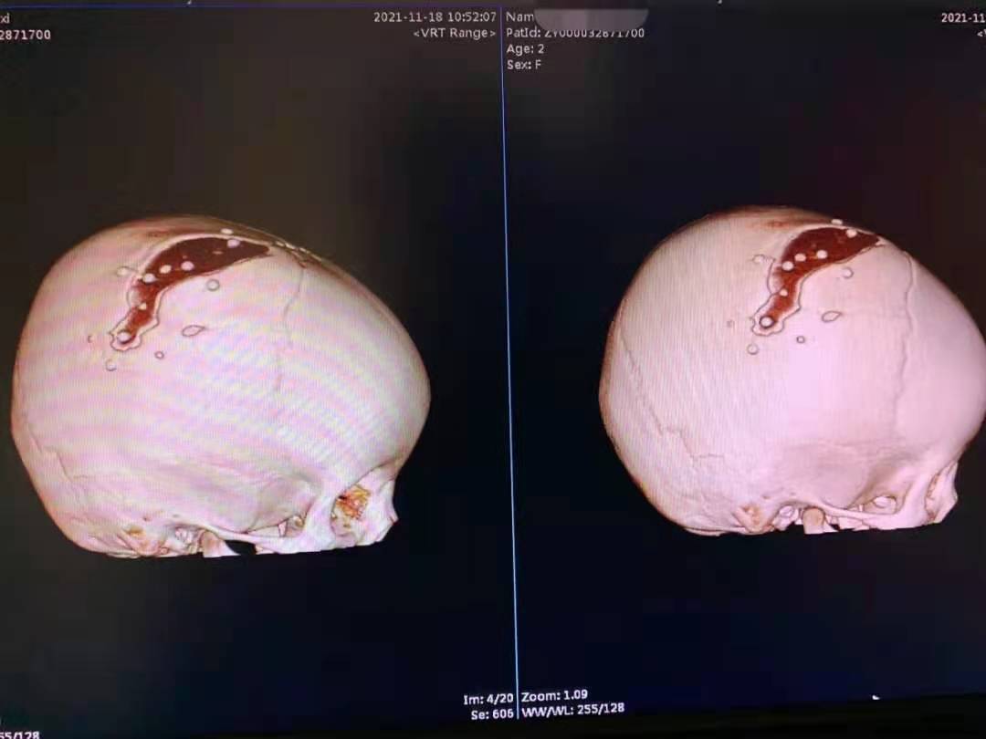 据了解,一年前,患儿小溪(化名)因外伤致颅内血肿、颅骨骨折,经治疗痊愈出院,但因颅骨生长原因,导致局部颅骨缺损,脑组织失去了一块保护罩。11月10日,小溪来到河池市人民医院神经外科就诊,神经外科罗铸主任详细询问其病情,经过科学的诊断,进行薄层CT扫描,发现小溪的右侧额顶部颅骨缺损、脑膜膨出,手术指征明确。罗铸主任立即采集小溪的头颅数据,进行三维重建设计,应用3D打印技术制作出个性化、精准适应患儿缺损骨窗的聚醚醚酮PEEK修补板。