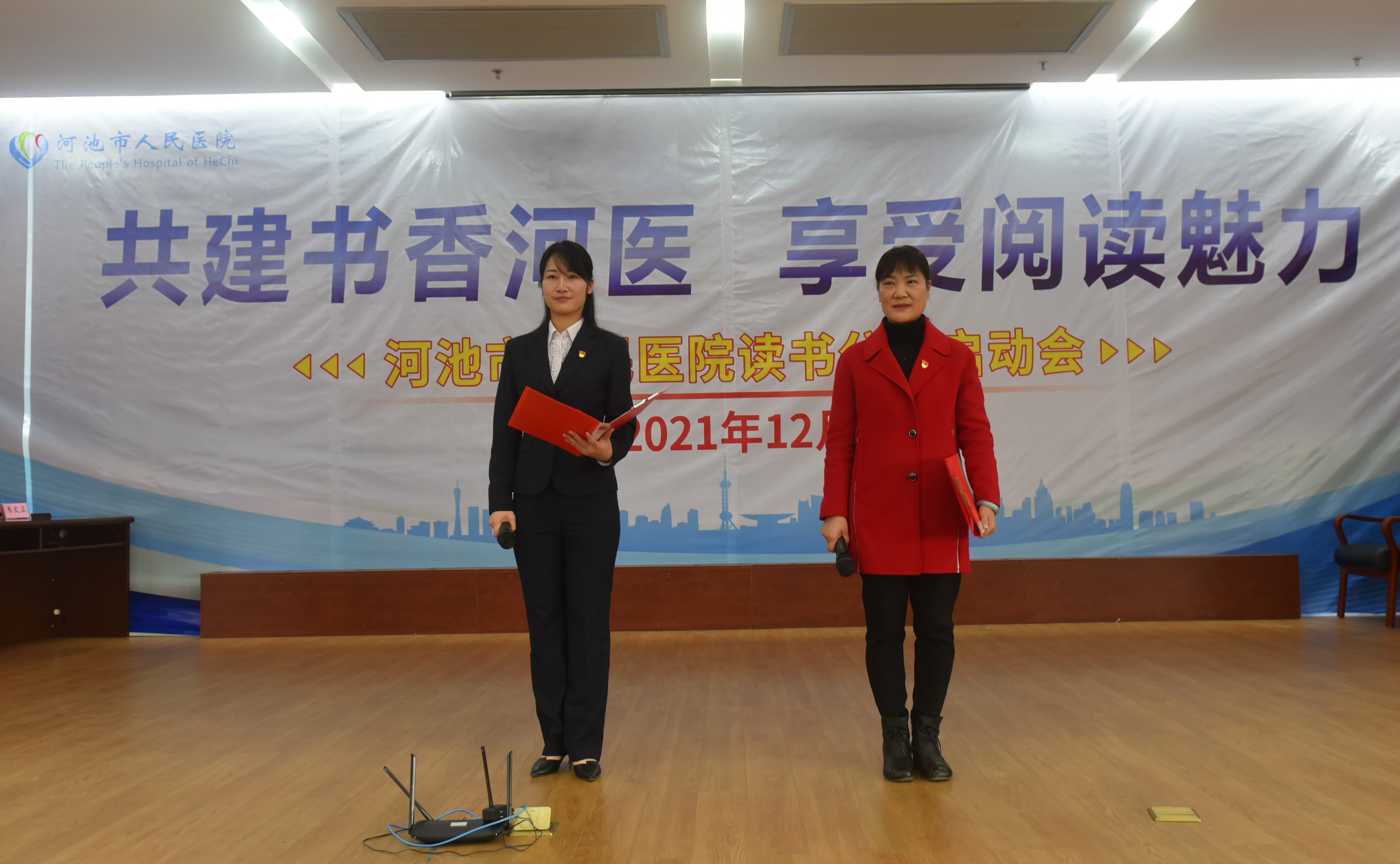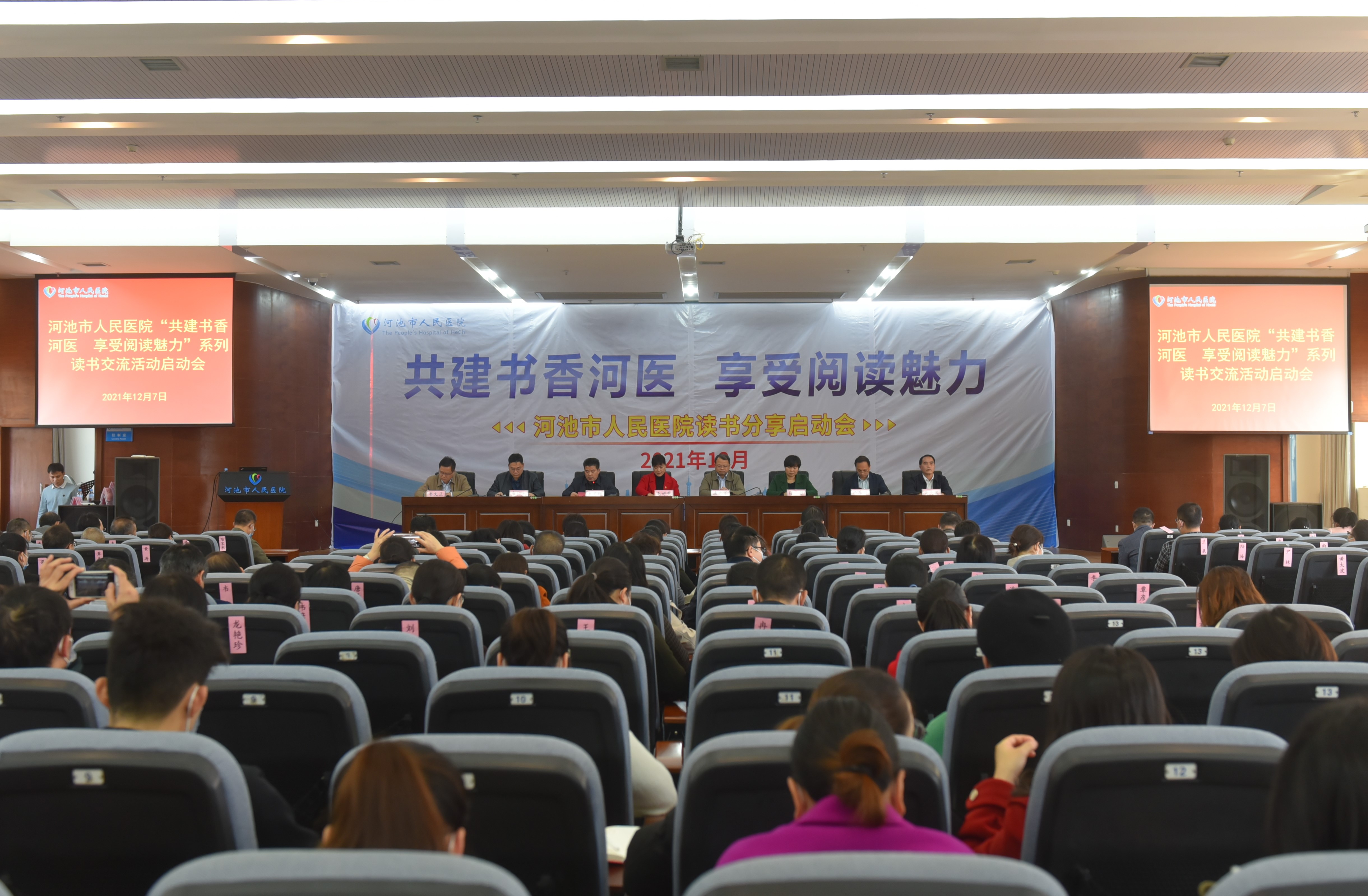 为营造书香医院的文化氛围,弘扬医学人文精神,12月7日,河池市人民医院在门诊综合楼23楼会议室举行“共建书香河医 享受阅读魅力”读书分享启动会。会议邀请到市委宣传部理论科科长毛妤斐同志出席,医院领导班子成员、全院中层、读书小组、职工代表等350余人参会。会议由副院长余乐周主持。