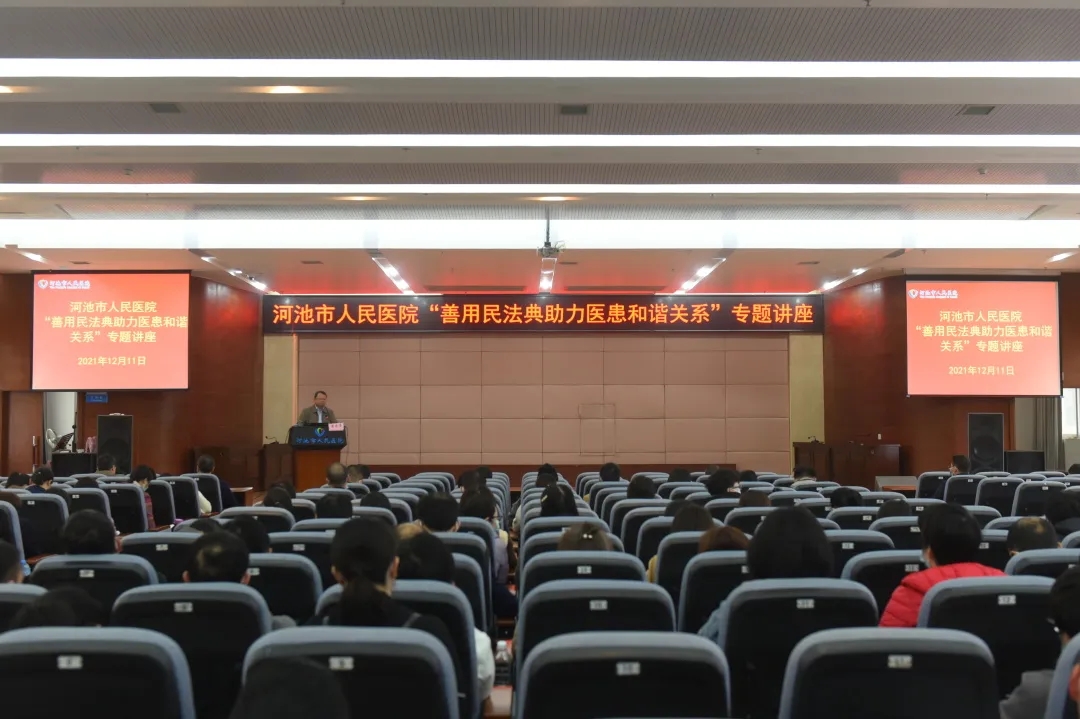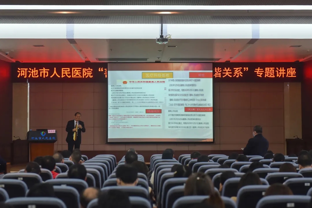 为进一步提升全体医护人员的法律素养,更好地构建和谐医患关系,12月11日,河池市人民医院在门诊综合楼23楼会议室召开“善用民法典助力医患和谐关系”专题讲座。会议邀请到广西科豪律师事务所主任、南宁市律师行业党委委员、南宁市律师协会副会长陆庆标莅临医院授课。医院领导班子成员、全院中层干部、各科室职工代表及党建医联体成员单位代表共400余人参加会议。会议由唐秀革院长主持。