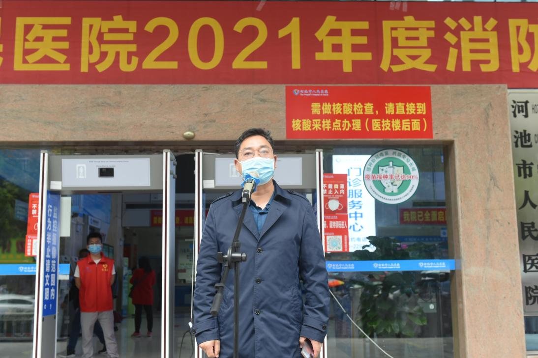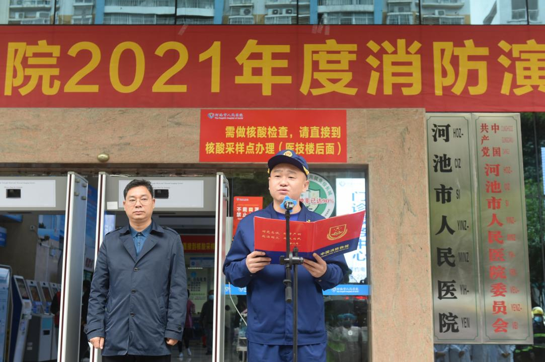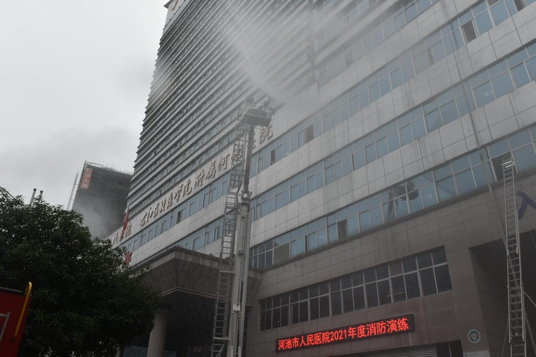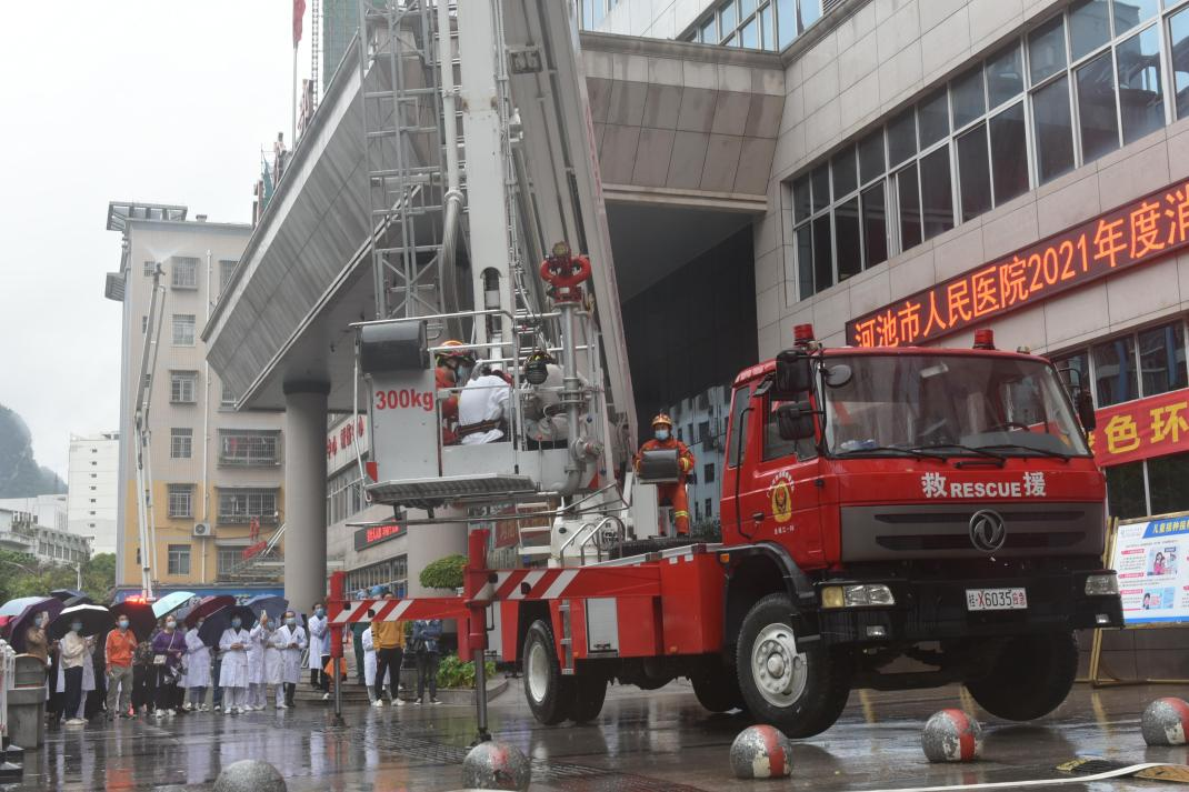 为进一步加强全院职工消防安全意识,掌握对突发火灾的应变、逃生技能,10月29日,河池市人民医院联合河池市金城江区消防救援大队在门诊综合楼开展以“人人参与消防,共创平安和谐”为主题的消防演练。院领导及科室负责人参加观摩指导。