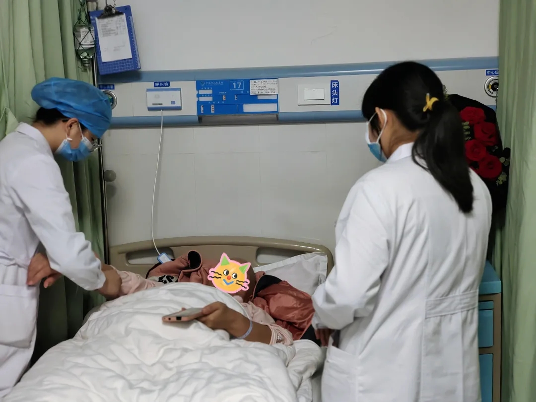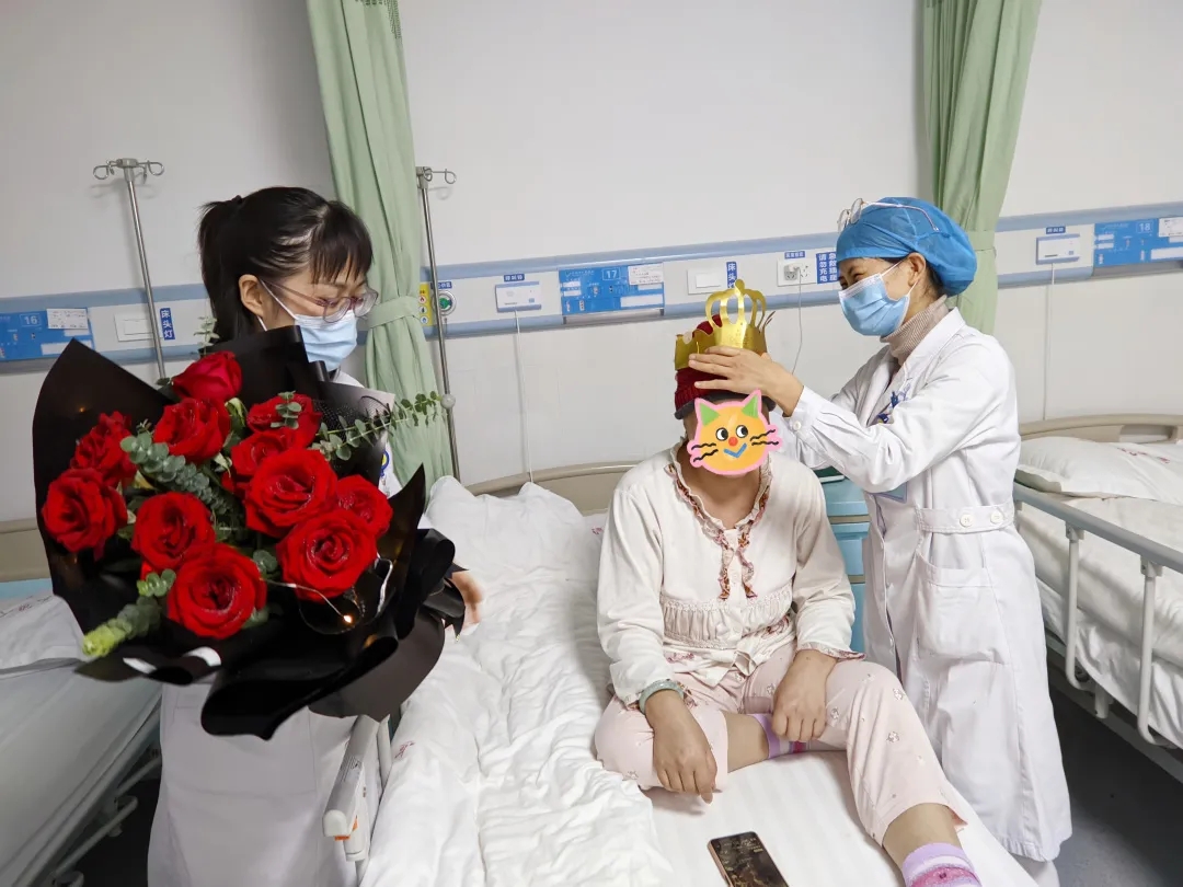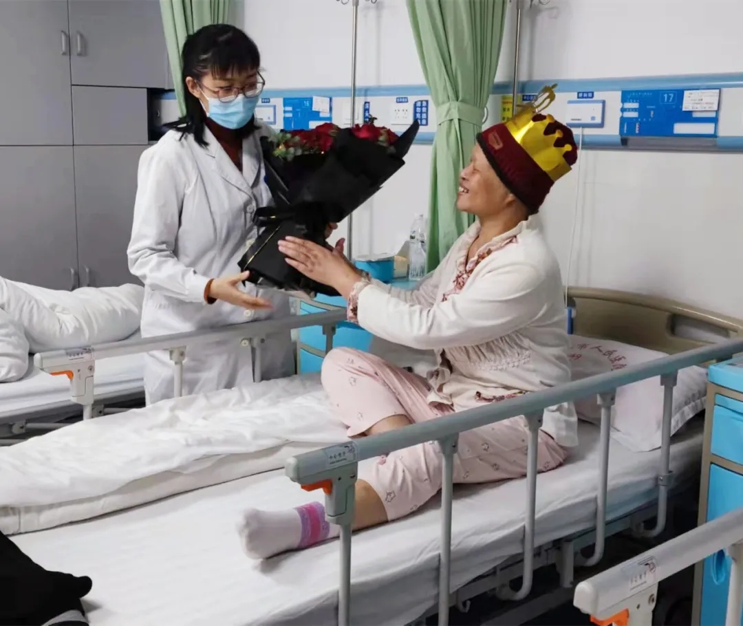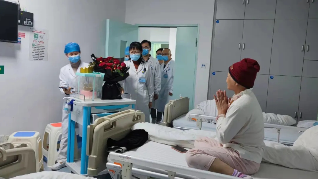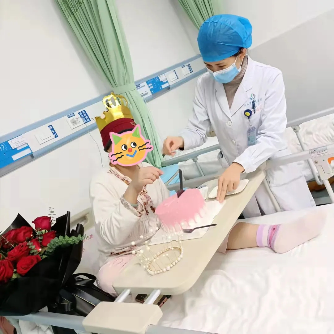 下午,科室医护人员推着蛋糕车走进黄阿姨的病房,吴燕副主任献上鲜花,朱金玉护士长为寿星戴上生日帽,大家唱起生日歌,为黄阿姨送上祝福语。看到这么多的医护人员为自己庆祝生日,黄阿姨含着激动的泪花回应道:“谢谢大家!谢谢大家的祝福,今年的生日我将终生难忘。”