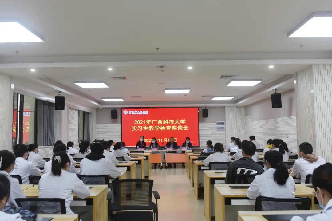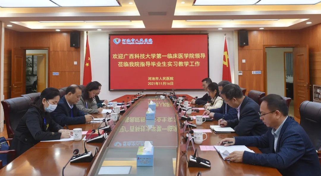 11月16日上午,广西科技大学第一临床医学院(第一附属医院)院长覃天一行4人到河池市人民医院开展毕业生实习教学检查工作,院领导班子、科教科全体人员、带教老师代表出席会议并陪同检查。会议由河池市人民医院副院长韦喆主持。