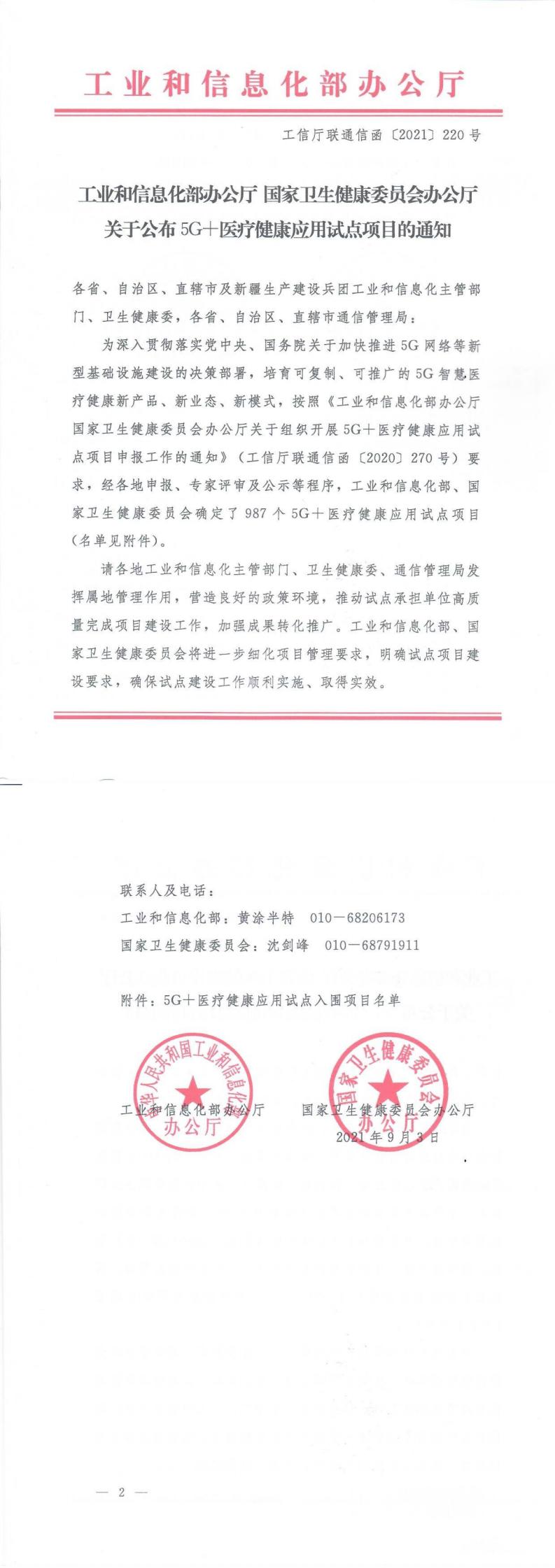 工业和信息化部办公厅 国家卫生健康委员会办公厅关于公布5G+医疗健康应用试点项目的通知