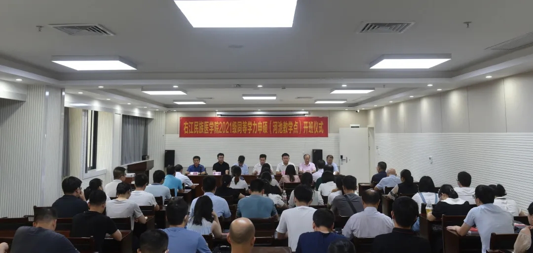 7月24日,右江民族医学院2021级同等学力申硕(河池教学点)在我院举行开班仪式。右江民族医学院副校长唐乾利、研究生学院院长陈秉朴、基础医学院院长黄衍强、研究生学院党委原书记黄赞松教授、市卫健委副主任胡大伟及我院领导班子出席开班仪式。河池教学点同等学力申硕学员共44人参加开班仪式,仪式由医院党委书记韦义甜主持。
