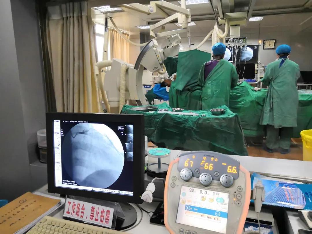 16时59分,患者送达导管室,心血管内科申勇副主任医师、梁承院副主任医师、陈桂主治医师及导管室人员已全部就位。心血管内科医疗团队急诊造影见患者左前降支近中段后、左回旋支近段后完全闭塞,立即予左前降支及左回旋支行PCI术,术后见支架膨胀良好,血流通畅,但患者病情极其危重,处于昏迷状态,生命征不平稳,需入住重症医学科进一步治疗。