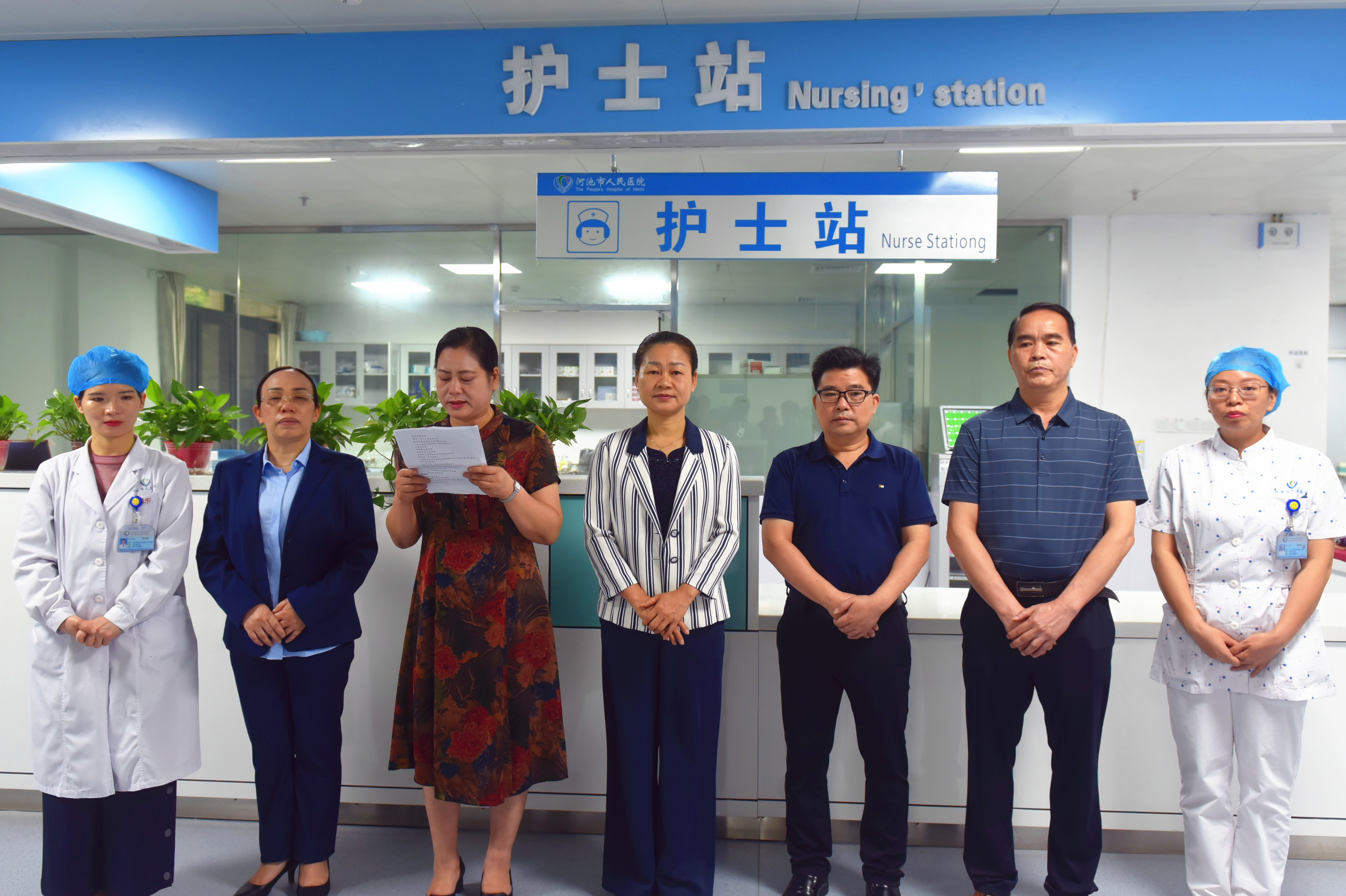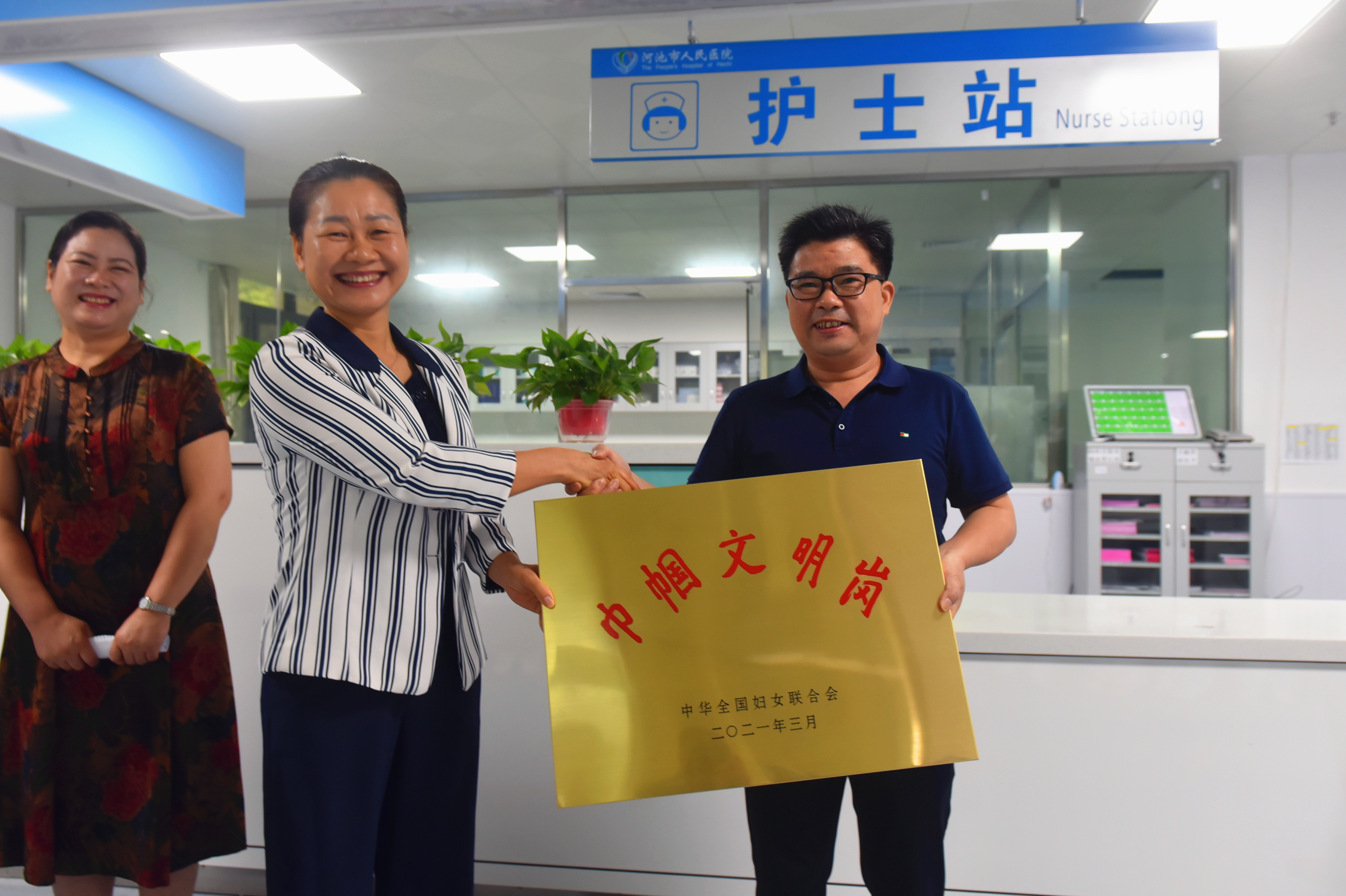 5月21日,河池市妇联党组书记、主席谢小菊、副主席李秀鸾莅临我院感染性疾病科,进行“全国巾帼文明岗”授牌,医院党委书记韦义甜、工会主席黄天国、工会女工委欧雪群及感染性疾病科全体医护人员参与授牌仪式。