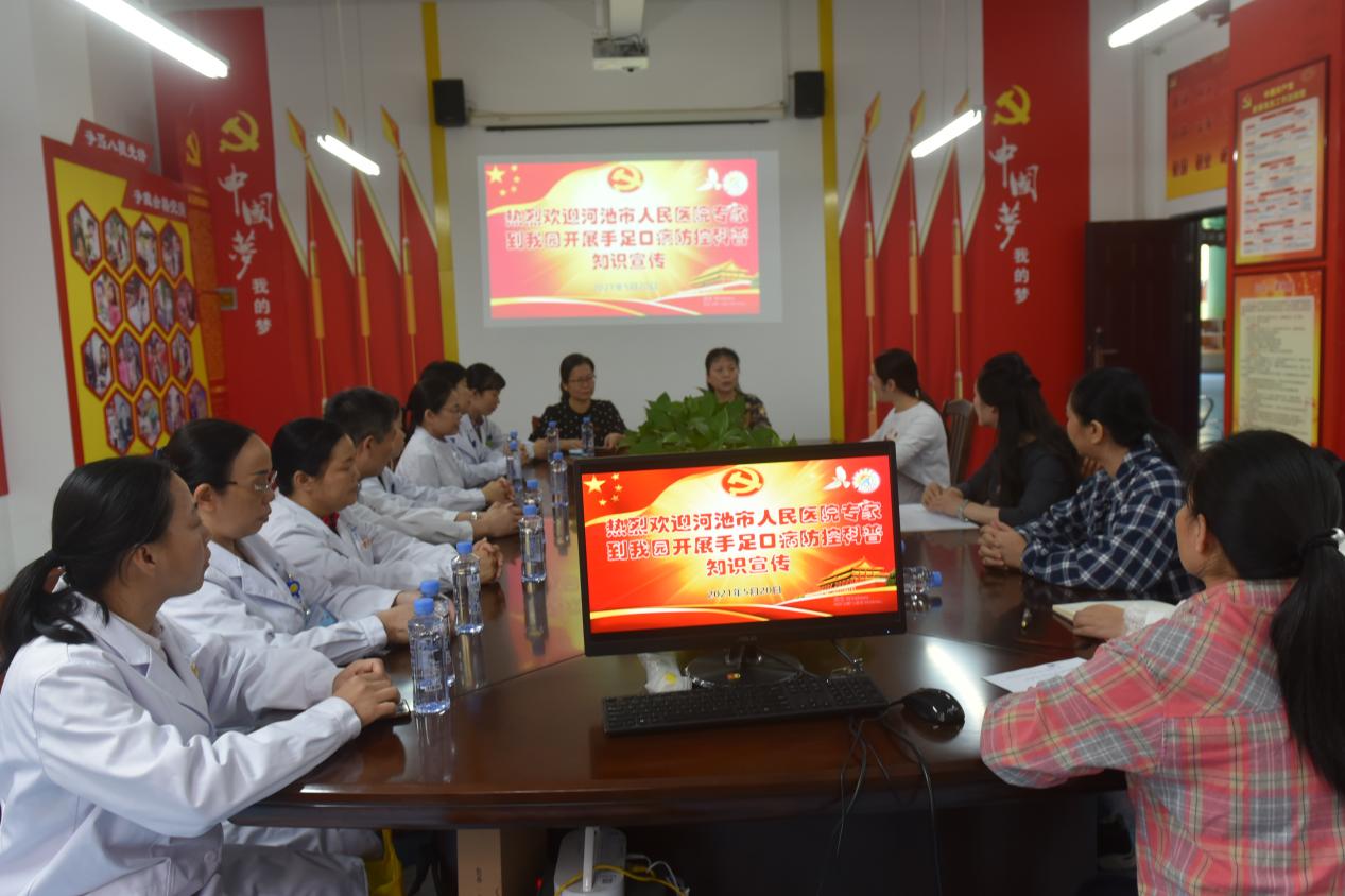 近期,金城江区手足口病疫情上升迅猛,为切实做好孩子们的疾病防控工作,帮助孩子们健康成长,5月20日,我院行政联合科室第二党支部、住培轮转人员党支部、儿科病区党支部组织10名医护志愿者到河池市市直机关幼儿园开展手足口病防控科普进校园宣传义诊主题党日活动。