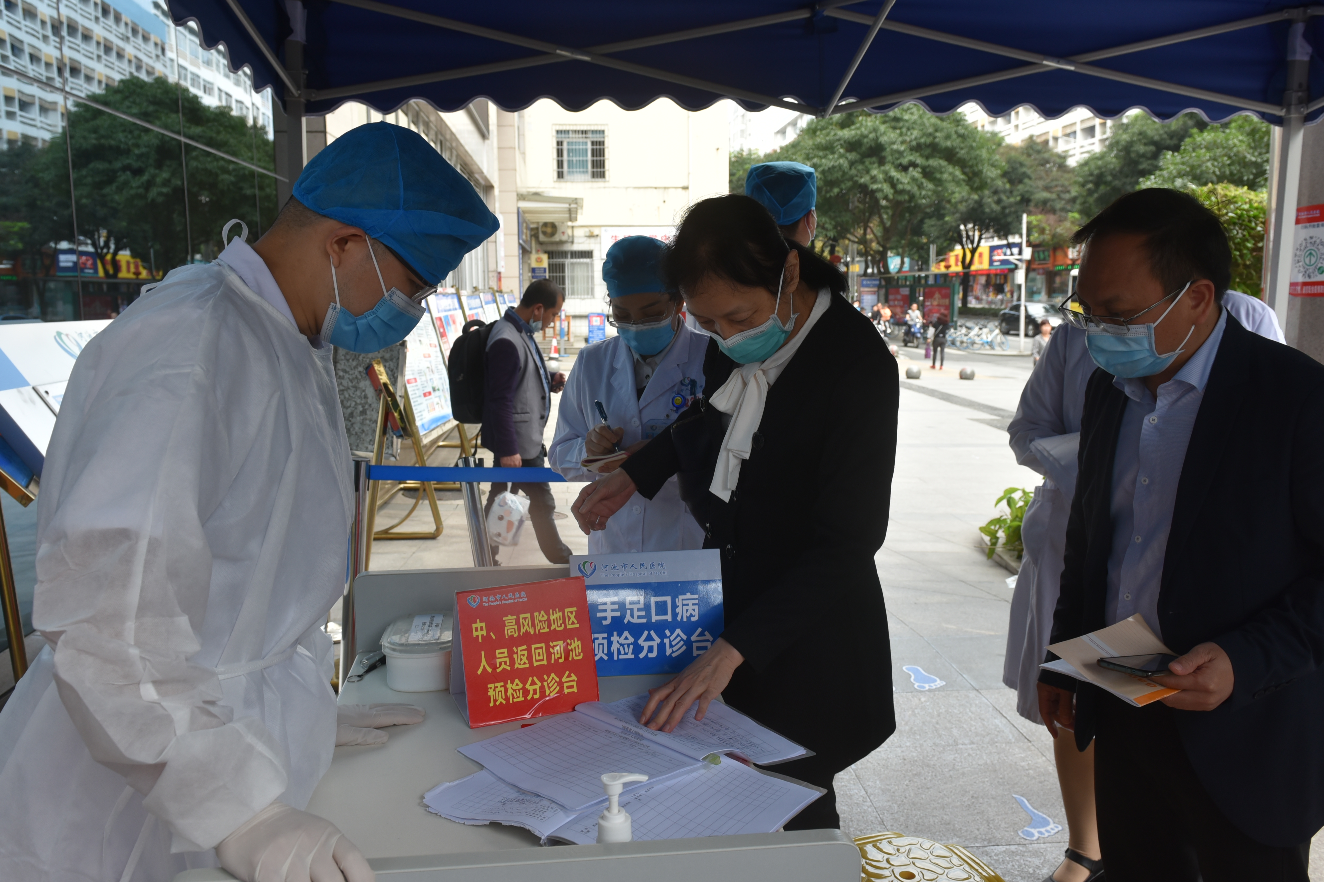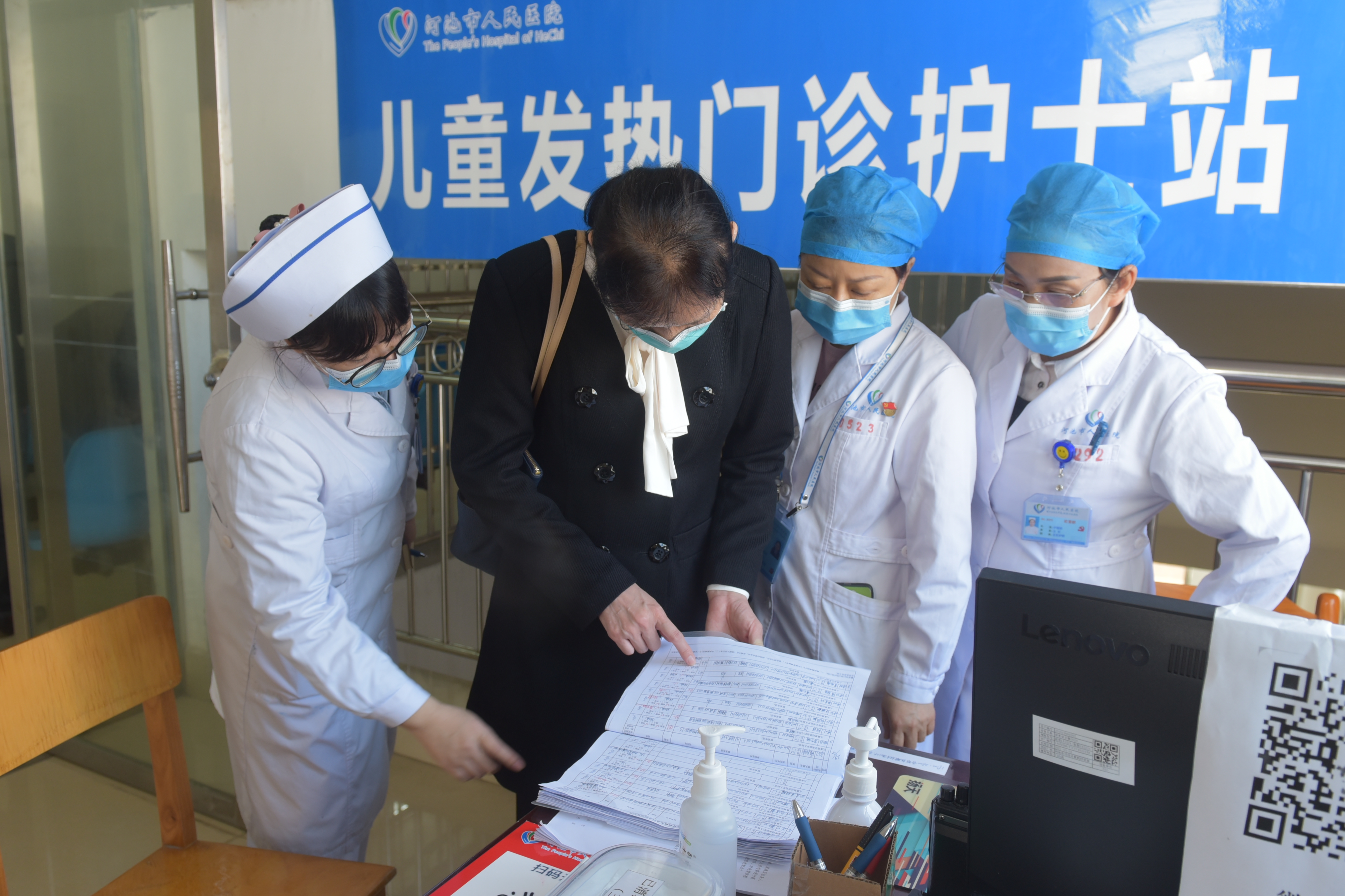 专家查看儿童发热门诊患者就诊登记情况