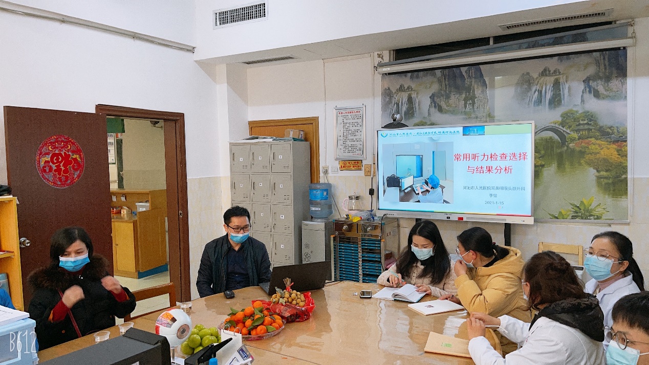 我院耳鼻咽喉科主任李健为环江县人民医院五官科医护人员进行听力相关知识培训