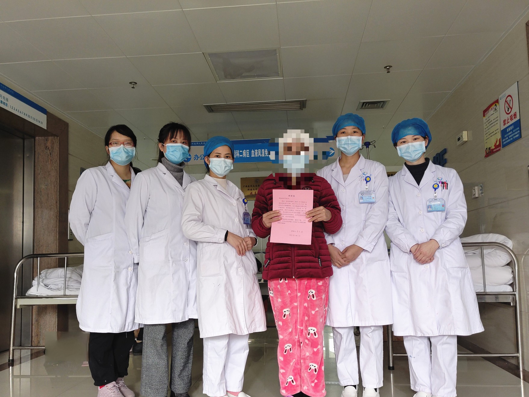 韦阿姨拿着感谢信和肿瘤科二病医区护人员合影