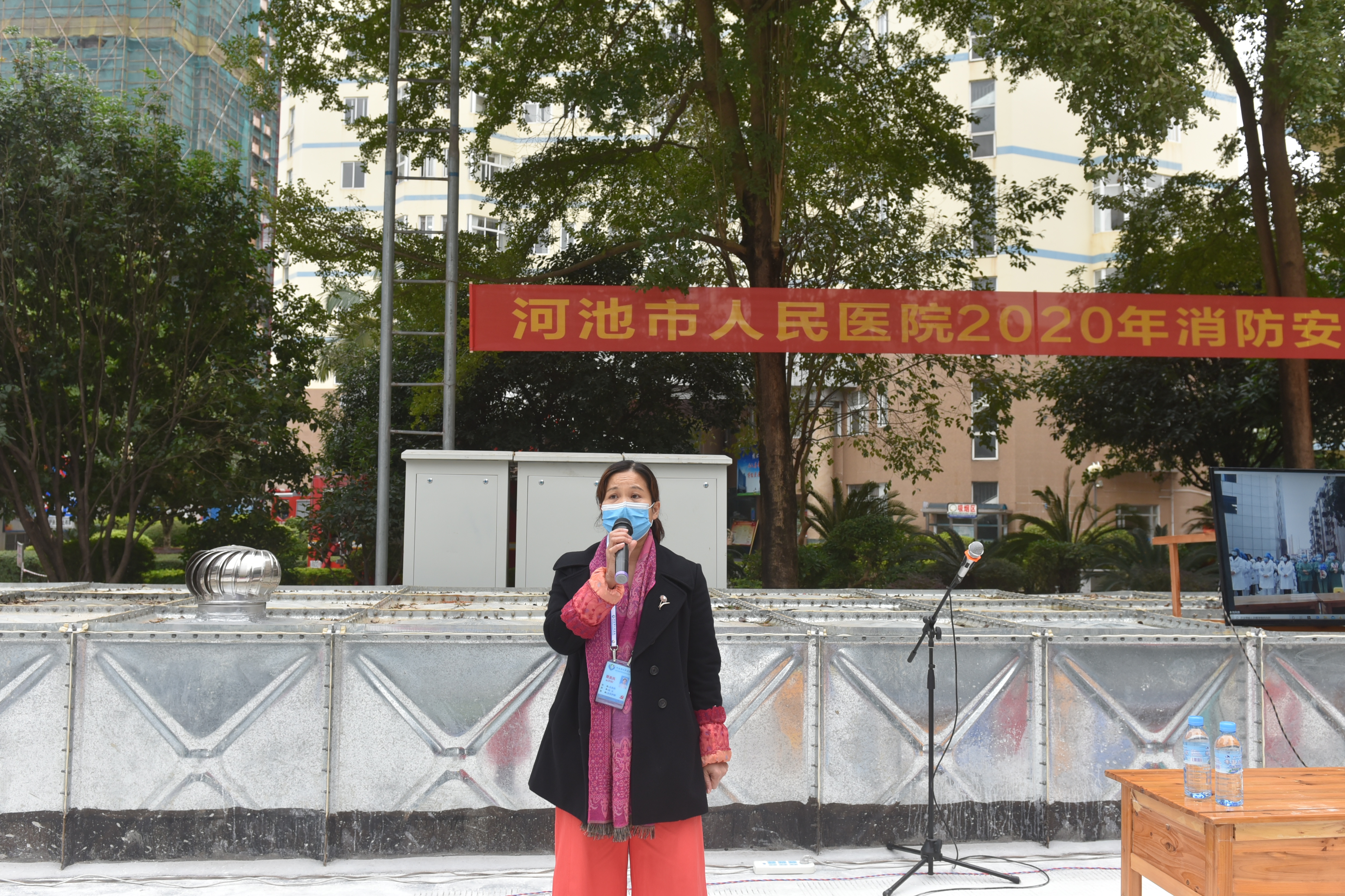 随着火势迅速蔓延,浓烟四处弥漫,在救援人员的带领下,大批医护人员、患者及家属从安全通道紧急疏散到安全区域。随后消防救援大队支援力量赶到现场增援,层层搜救和排查,救出6名被困人员,并利用云梯解救1名行动不便的患者,整个过程快速、有序、安全、顺畅。经过1个小时的紧张“救援”,消防演练顺利结束。总务科科长覃美凤做演练总结,文体路消防救援站梁凌松站长对此次演练进行讲评和现场培训消防安全知识。