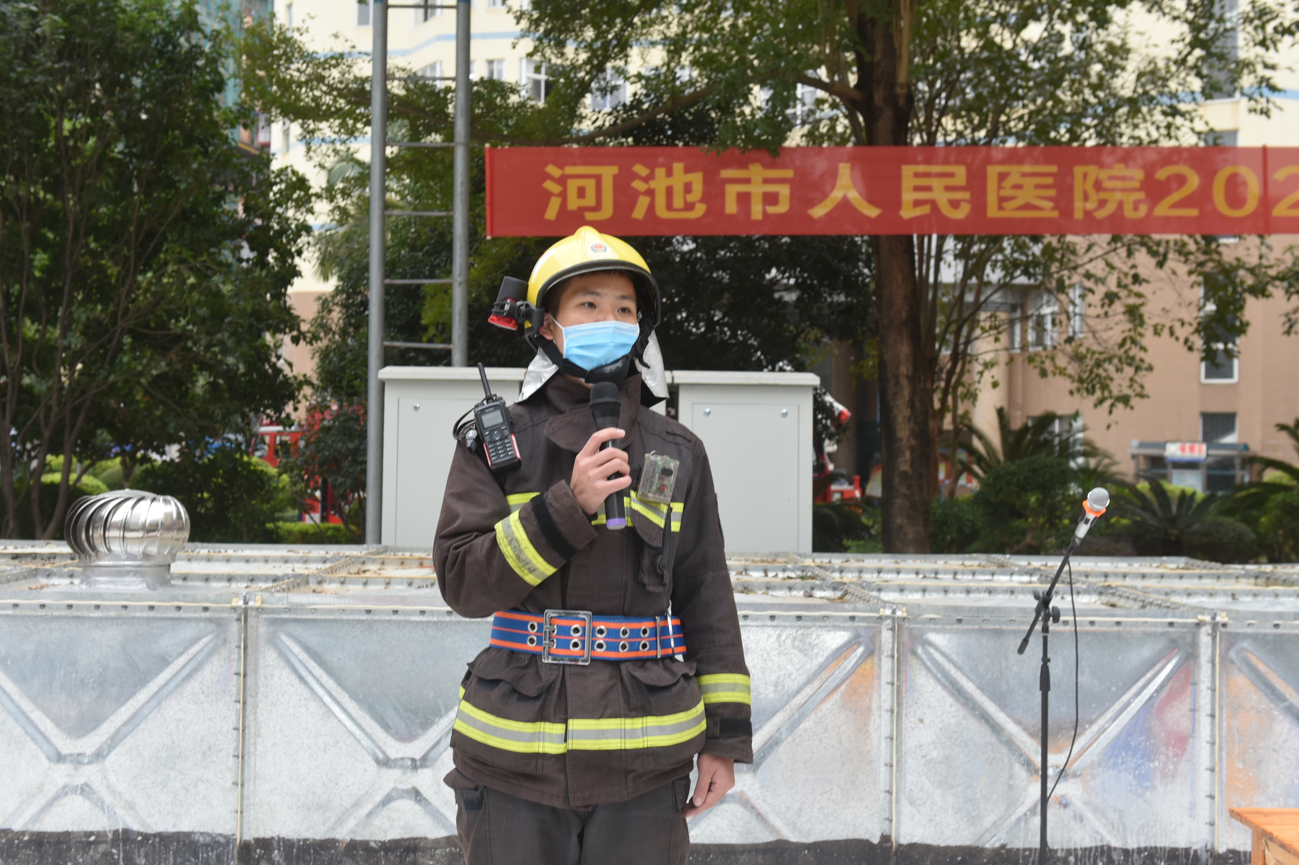 12月9日,我院联合河池市金城江区消防救援大队,在医院外科楼开展了大型消防应急演练。河池市卫生健康委调研员韦寿繁、金城江区消防救援大队长唐朝东到场观摩指导,市人民医院副院长韦仁杰主持演练。