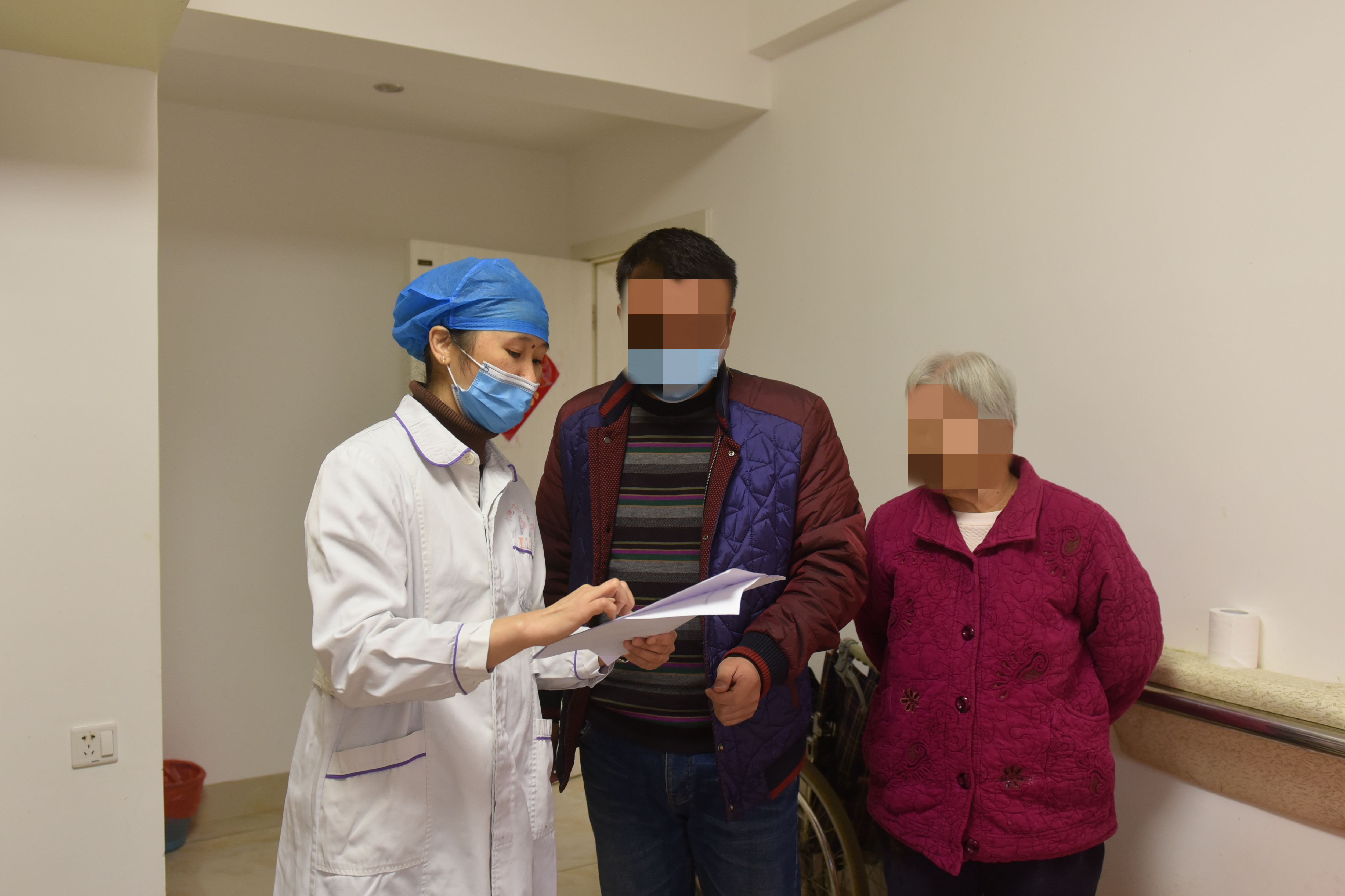 护理人员向家属讲解留置尿管的注意事项和家庭护理等健康宣教
