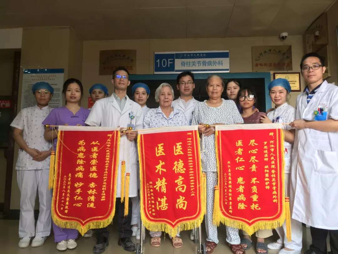 近日,覃阿姨及其家属带着“医德高尚 医术精湛”、“尽心尽责 不负重托 医者仁心 患者病除”两面锦旗送到我院脊柱关节骨病外科,真挚的表达了她和家人对医护团队的感激之情。