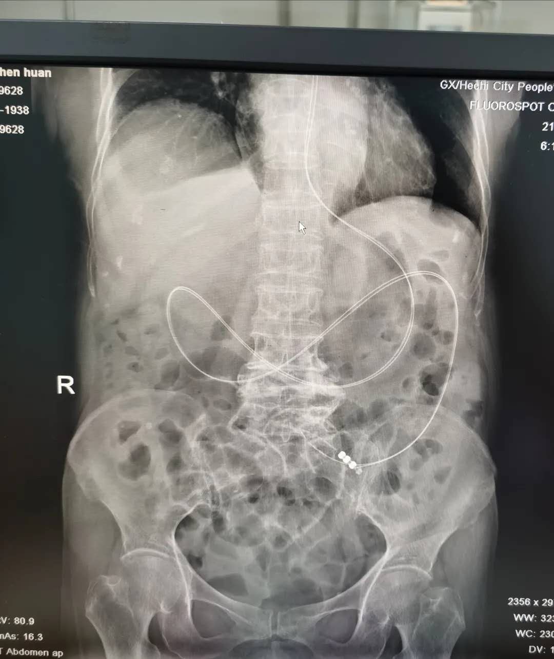 9月21日下午,超声科韦荣文主任、神经外科盘丽华护士长共同为患者行超声引导下鼻空肠管置入术,由于空肠管较长加上途经的解剖结构复杂,曲折,空肠管能顺利穿过幽门是置管的关键和难点,但最后经过两人默契的配合,顺利地将空肠管经鼻腔、胃到达十二指肠,成功置入患者空肠内,手术过程中患者无呛咳、无胸闷气促等现象,置管手术顺利完成。术后,经过腹部平片检查,结果显示该管道完整到达空肠腔内。置入后患者无不良反应,进食后无发生呕吐现象。