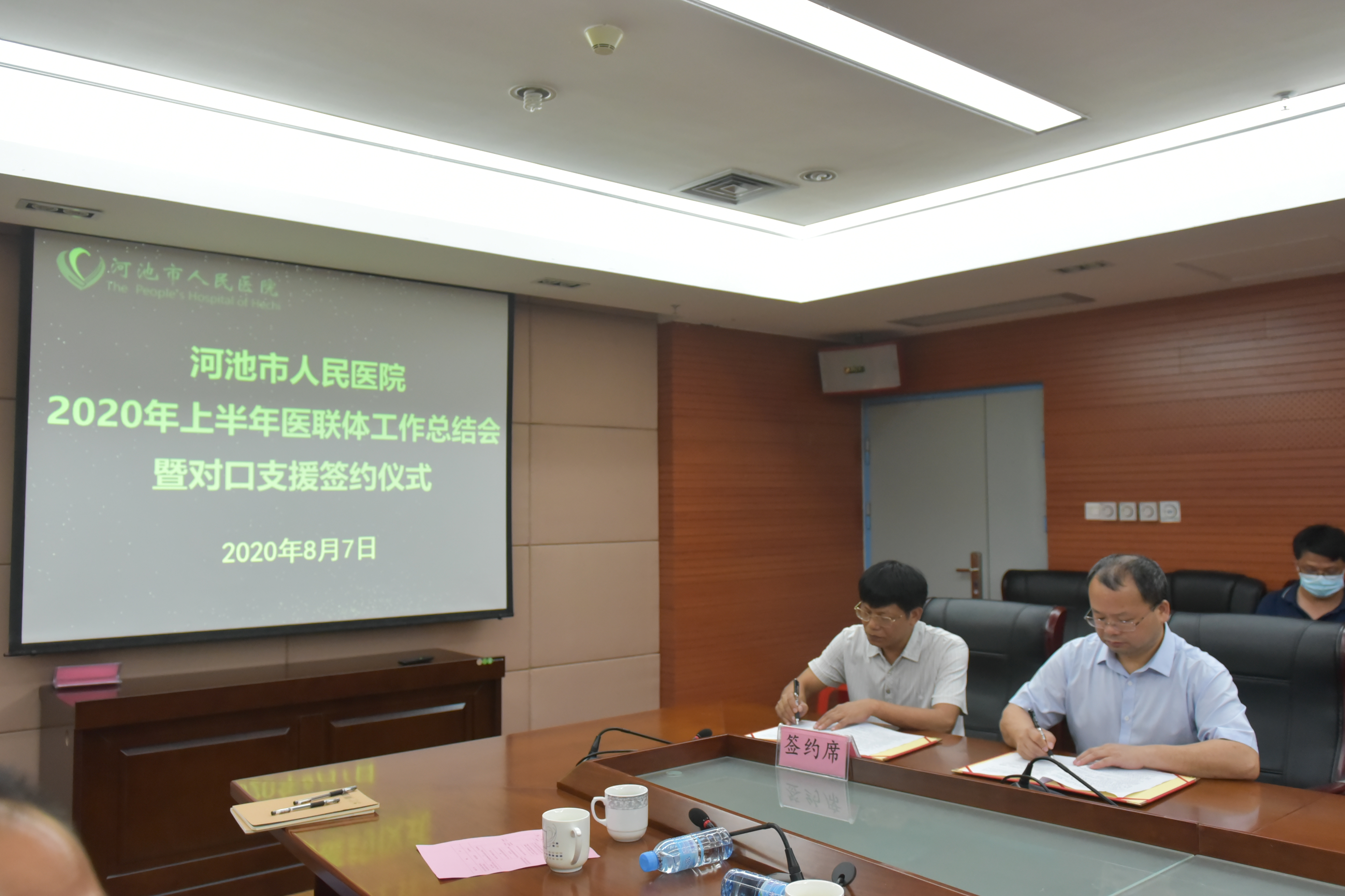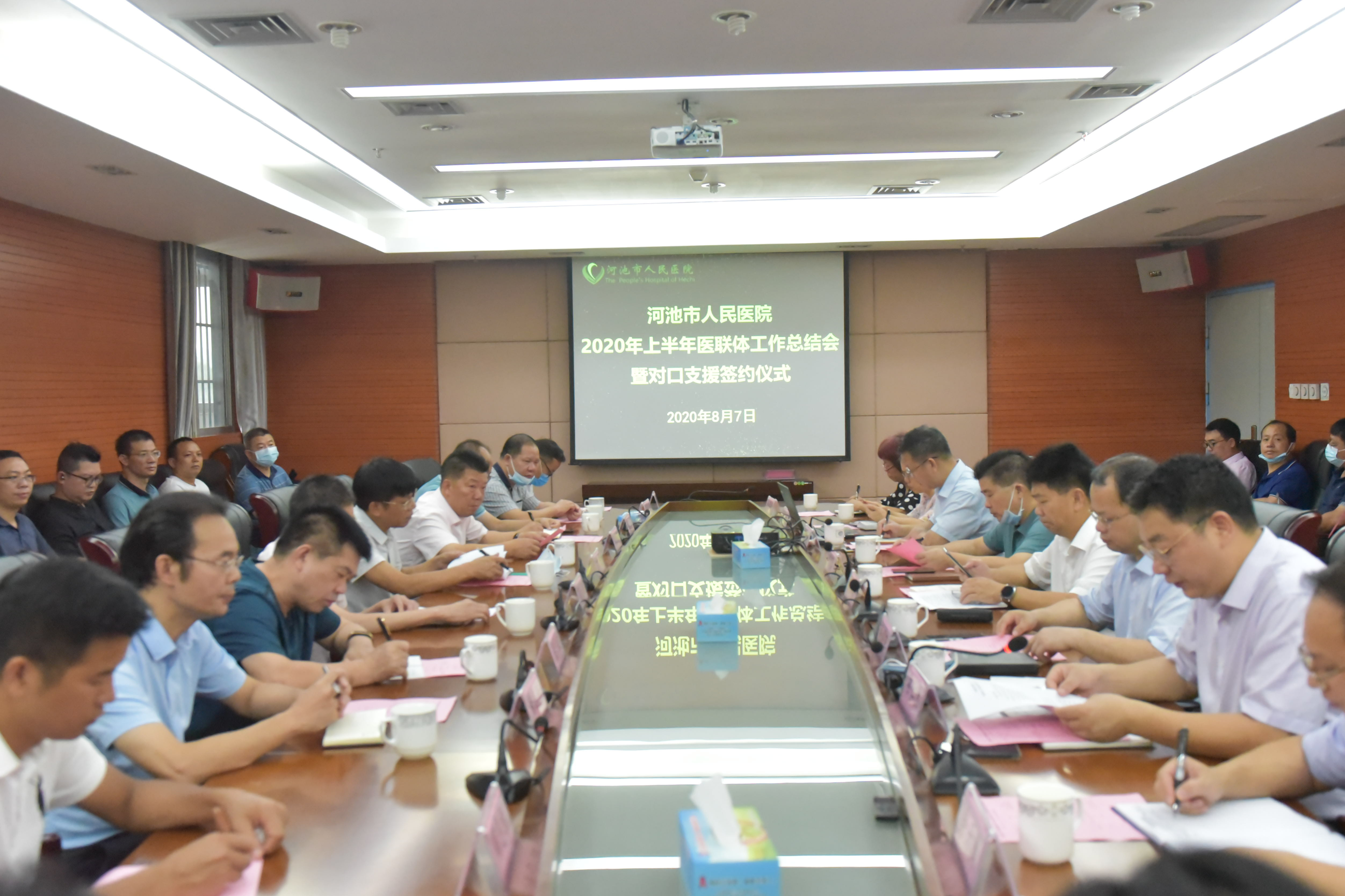 2020年8月7日,我院在22楼会议室召开2020年上半年医联体工作总结会暨对口支援签约仪式。河池市卫健委主任韦东禄,我院领导班子,各医联体成员单位院长、分管副院长以及相关职能科室负责人共60余人参加会议。