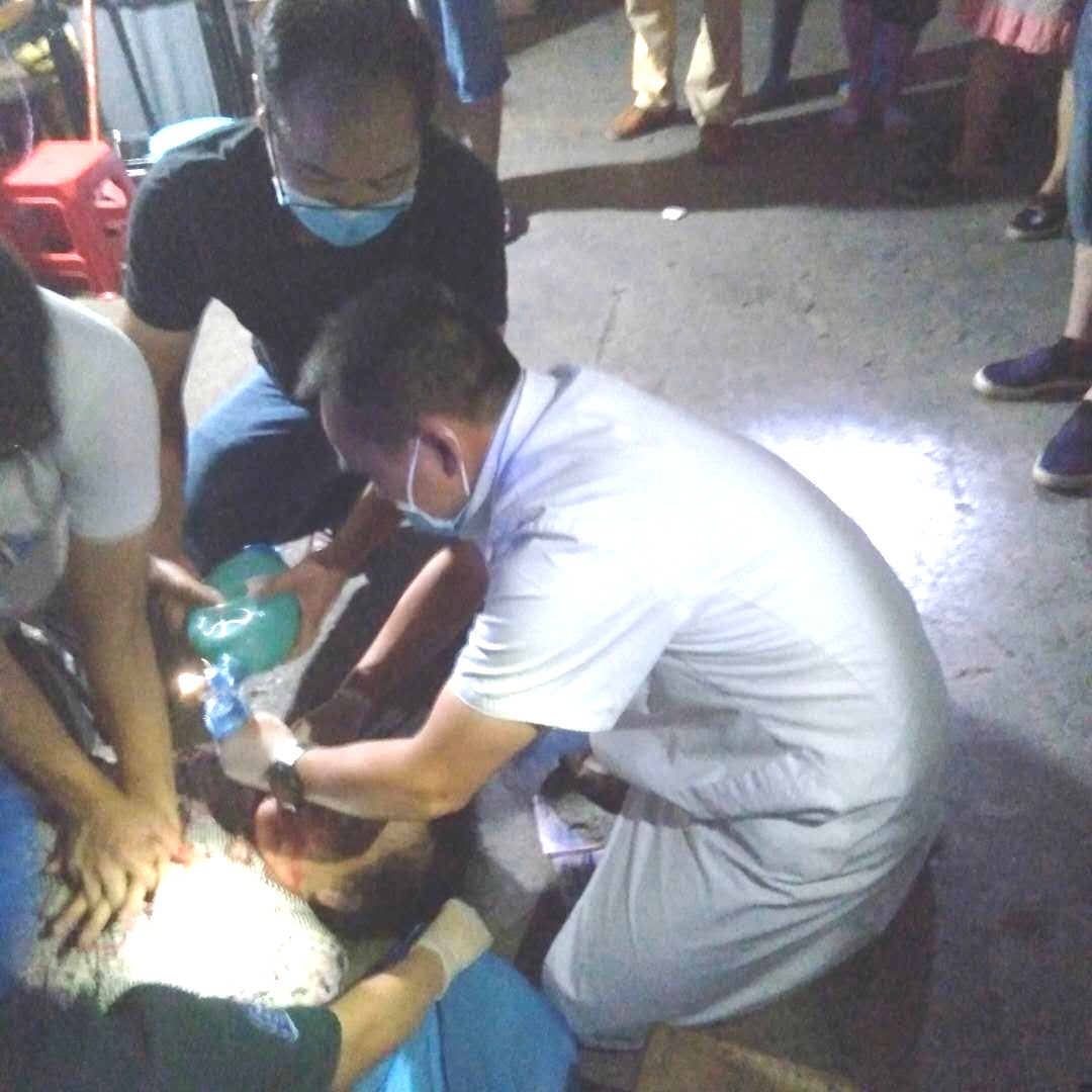 只见晕倒的女士约50多岁,躺在当地,毫无意识,周围的人不知所措。韦汉密俯身查看,发现患者意识丧失,他马上通过手机电筒观察患者双侧瞳孔情况,瞳孔对光反射消失,直径5.0mm,触摸颈动脉无搏动,无自主呼吸。韦汉密立即摆正患者呈心肺复苏体位,随即跪在地上进行徒手心肺复苏,持续予胸外心脏按压,开放气道等,并疾声呼叫周边群众赶紧拨打120。