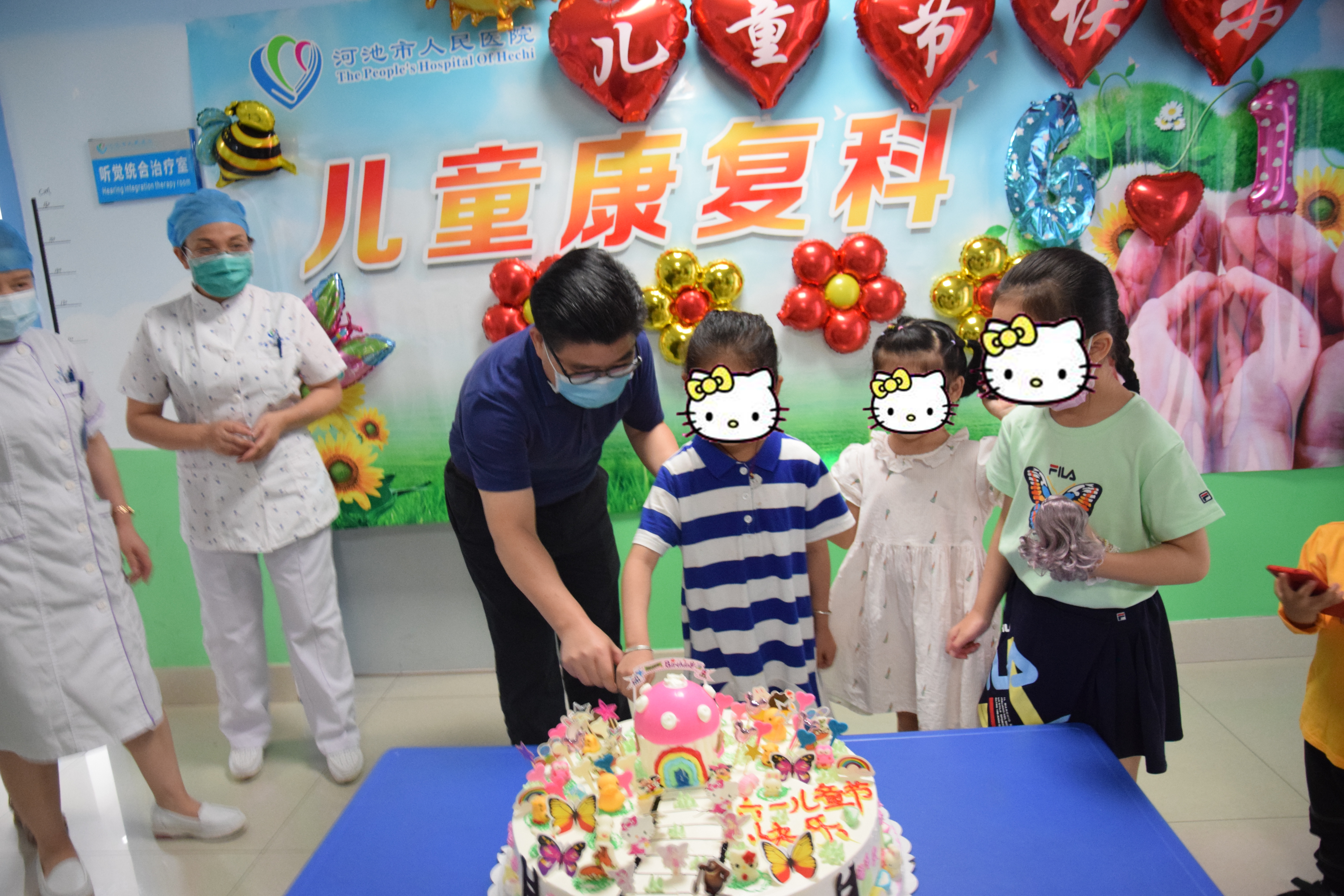 在儿童康复科,韦义甜书记、韦喆副院长以及相关科室负责人给小朋友们送上暖心的祝福语,祝福他们健康快乐,茁壮成长。韦义甜书记和小朋友一起切了节日蛋糕,并为孩子们发放精美的“六一”礼物,孩子们的脸上洋溢着幸福快乐的笑容。儿童康复治疗师们精心设计了一系列温馨的亲子互动游戏,游戏现场充满欢声笑语。虽然孩子语言表达能力和肢体运动能力有限,但他们都积极参与到游戏里,完成了一个又一个挑战,树立了坚强的生活信心。
