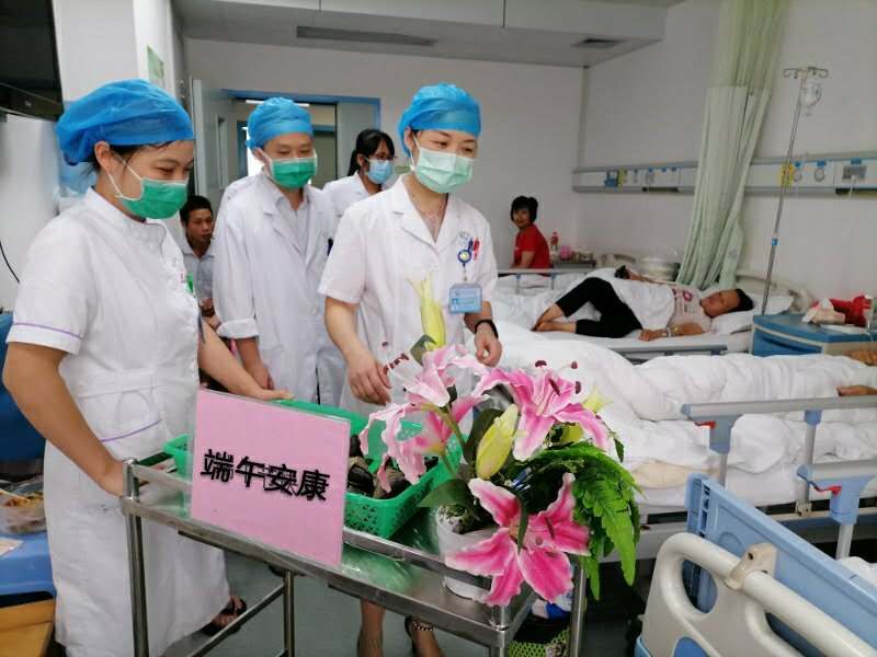 为深入开展优质护理服务,增强患者的归属感、信任感及安全感,端午节当天,为了让患者感受到“家”的温馨,过上一个温暖的端午节,科室主任韦金华和护士长韦香葵带领科室医护人员,携带科室精心准备的粽子,来到病房内,把一个个裹满了祝福和爱的粽子送到患者及家属手中,他们不但为每个住院患者送上精心准备的端午香粽和节日的祝福,还嘱咐患者们注意身体,早日康复,祝愿他们“健康常在,欢乐常伴”。