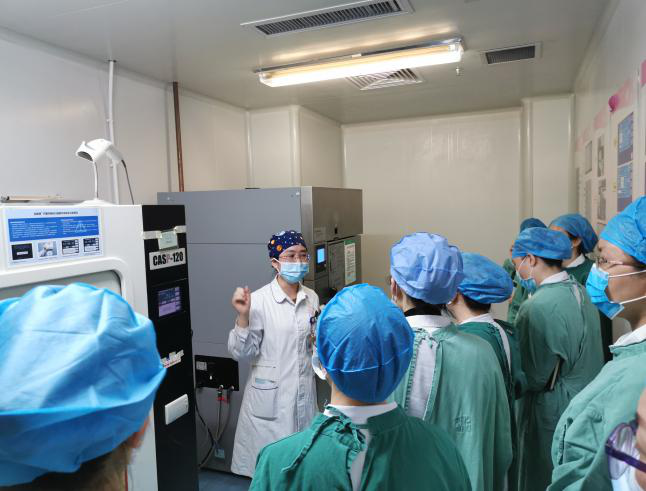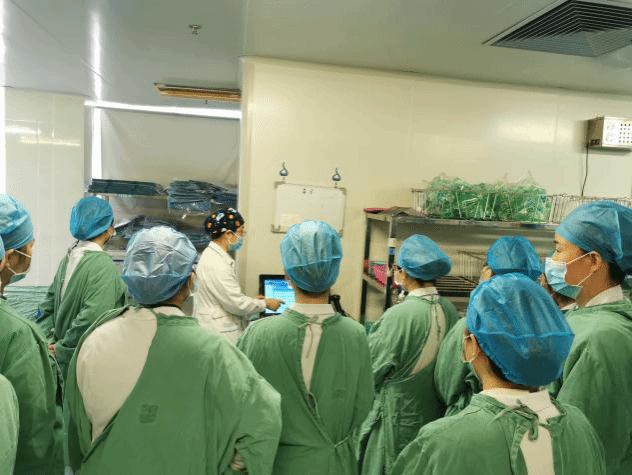 在灭菌区,各科室参观者观摩了灭菌设备设施,实地了解灭菌设备、压力蒸汽灭菌器、低温等离子灭菌器以及环氧乙烷灭菌器的工作原理,并了解到灭菌方式的选择,灭菌程序的运行时间等。同时唐护长还给各科室人员答疑解惑,让他们知晓器械处理时间以及设备的周转时间,以便临床科室在今后能更好合理安排手术。