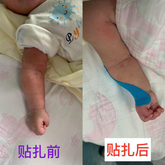 针对这些问题,康复治疗师给予了运动、作业及感统等康复训练之外,还将KT应用于患儿手部,通过拉力将异常的前臂及拇指姿势控制并维持在正确的位置上,长时间持续的牵拉力在一定程度上缓解痉挛,降低肌张力,同时给予患儿一定的感觉刺激,强化手部触觉和深感觉的刺激,有效提高了患儿的康复效果。