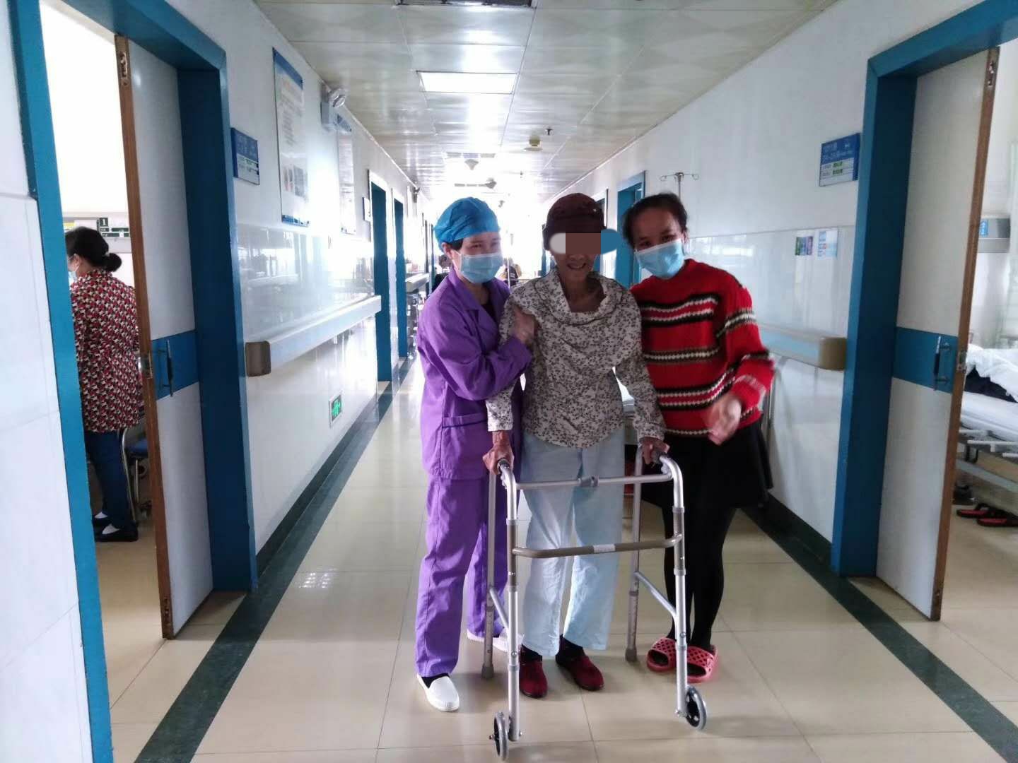 现代康复理论认为,早期康复对骨折患者尤为重要。为了能让林阿婆能够早日康复,术后康复医学科团队立即对林阿婆身体状况进行了全面的评估,术后第一天,康复治疗师梁艳群便开始对林阿婆进行康复训练,在无痛状态下对林阿婆进行关节活动度训练与等长肌力训练,目的在于保持关节活动度以及防止废用性肌萎缩并增强肌力。同时,利用微波和静电进行局部治疗促进伤口愈合,并采用关节功能训练仪(CPM)对林阿婆进行下肢活动功能训练。术后第四天,治疗师指导林阿婆坐立于床边,并协助她使用助行架进行负重训练以及重心转移训练。在进行几天的站立训练后,林阿婆正式进行助行架辅助下的步行训练:5米,10米,15米……随着训练阶段的推移,林阿婆能够走的越来越远,术后10天,林阿婆就能够摆脱助行架,在家人的搀扶下进行正常的步行!