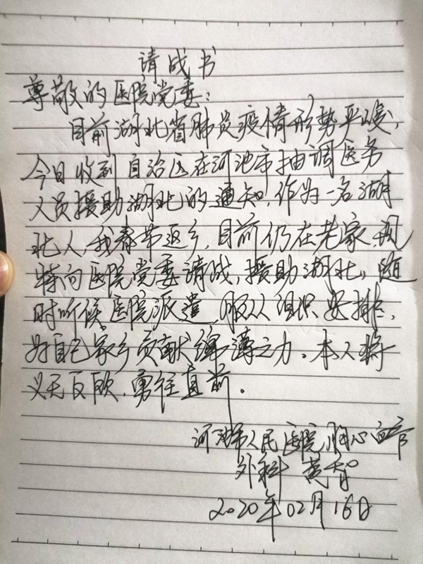 医院胸心血管外科黄智医生第一时间向院党委递交请战书,作为一名湖北人,他希望能为家乡贡献自己的绵薄之力。朴实的语言,义无反顾的决心,体现了他的责任担当,也诠释了一份浓浓的医者仁心。