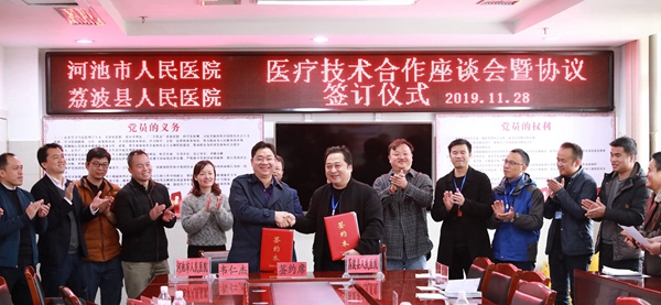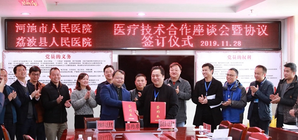 在签订仪式上,唐秀革院长指出,此次与荔波县人民医院签订紧密型医联体协议,是我院在深入贯彻落实国家医改精神,深化公立医院改革的背景下,成立的首个跨省域紧密型医联体。我院将根据荔波县人民医院需求,采取技术帮扶、人才培养、巡回医疗、双向转诊、分级诊疗等方式与其开展合作,让荔波人民得到更好的医疗服务保障。