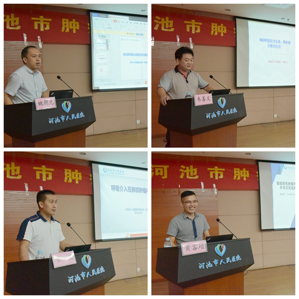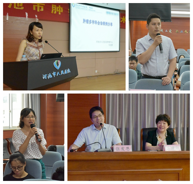 我院胸心血管外科覃洪斌主任、消化内科姚朝光主任、耳鼻咽喉科韦善文主任、呼吸内科韦庆主任、普通外科黄客增副主任医师分别就“肺癌的基因检测与靶向药物治疗”“消化道早癌诊治现状及内镜治疗进展”等课题作了精彩演讲。我院肿瘤中心副主任张发恩和肿瘤科二病区负责人韦亚娜分别就“乳腺癌治疗新进展”、“肿瘤多学科会诊病历分享”进行授课。授课期间专家和参会人员积极互动,会场气氛热烈,使前来参会的人员吸取了更多学术经验,了解最新专业资讯。
