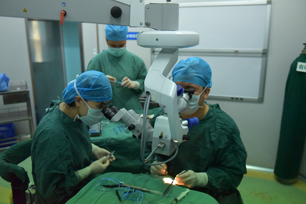 仪式启动后,九三.裕同慈善基金会河池帮扶工作组同我院梁涛院长来到眼科病房考察工作,了解我院眼科在管理、科研、服务方面的水平情况。在查看并询问患者情况后,深圳市第二人民医院窦晓燕主任医师,在深圳市眼科医院袁芳兰主管护士和我院眼科主任翟建伟副主任医师共同配合下,顺利为河池6名贫困患者实施白内障超声乳化摘除术+人工晶体植入术。