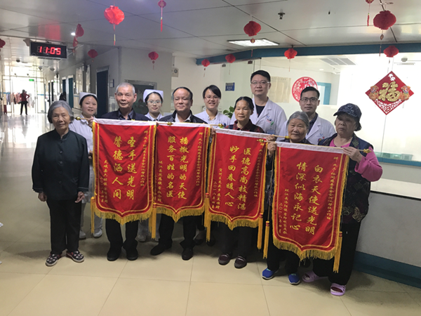 术后6名患者视力均明显提升,在九三.裕同慈善基金会和医院的共同努力下,贫困患者不花一分钱就通过手术重获光明。在4月27号上午,病人及家属将4面锦旗赠送九三.裕同慈善基金会河池帮扶工作组和我院医务人员手中,感谢社会及医院的关爱。